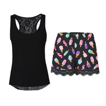 Neatie Kiddie Women Pajamas Set Home Lounge SetS Soft Clothes Lace Patchwork Black Tank Top Shorts Pants Sleepwear Night Pajamas