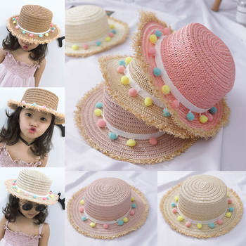Girls Summer Straw Hat Wide Brim Tassel Balls Floppy Panama Cap for Beach ED-shipping