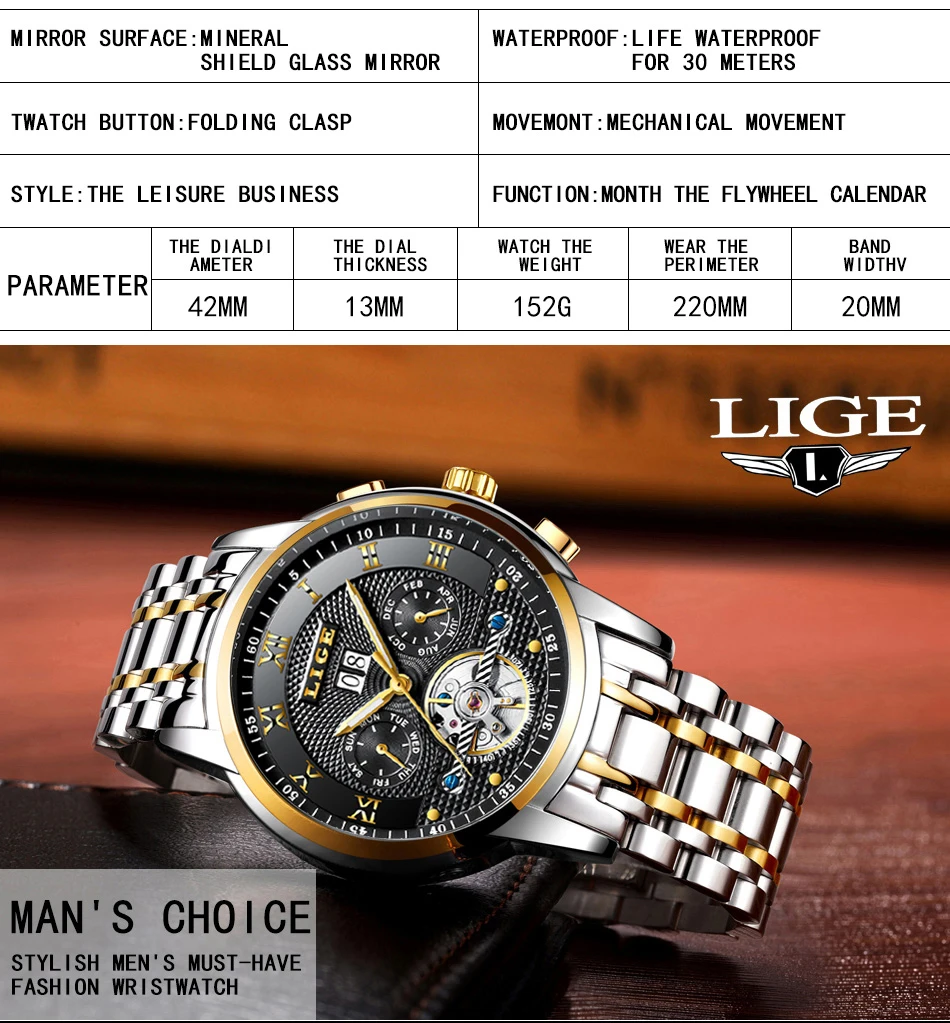 Relogio Masculino LIGE Mens Watches Top Brand Luxury Automatic Mechanical Watch Men Full Steel Business Waterproof Sport Watches