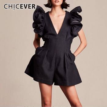 CHICEVER Solid Jumpsuits For Women V Neck Ruffle Sleeve High Waist Pockets Short Pants Female Jumpsuits Spring Fashion