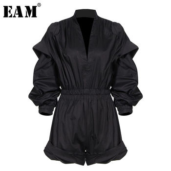 [EAM] Loose Fit Black Pleated Temperament Women Playsuits New High Waist Pocket Stitch Pants Fashion Spring Autumn 2020 1T128