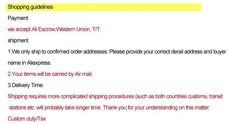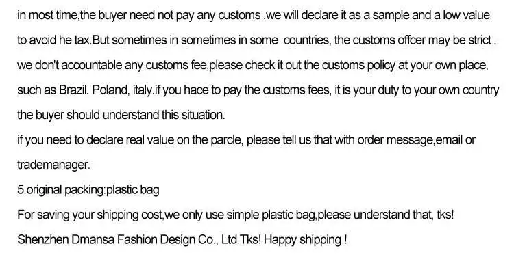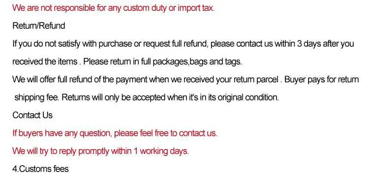 We are not responsible for any custom fees once the items have shipped. By purchasing our products, you consent that one or more packages may be shipped to you and may get custom fees when they arrive to your country.