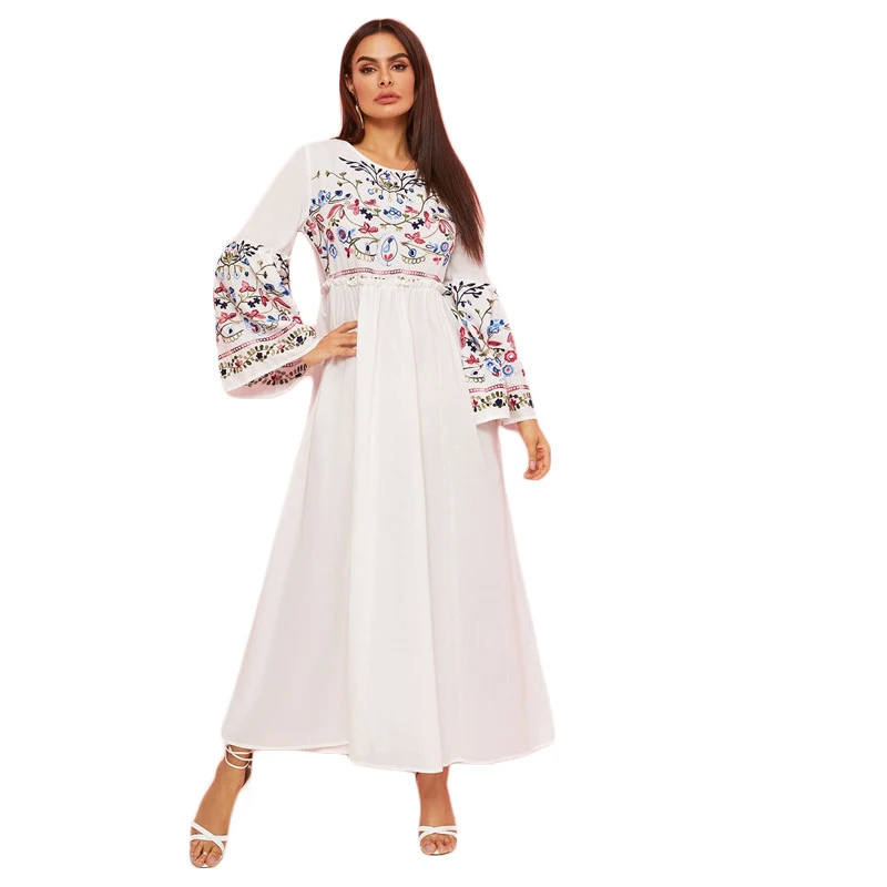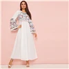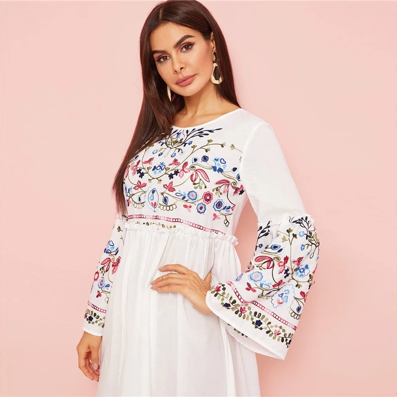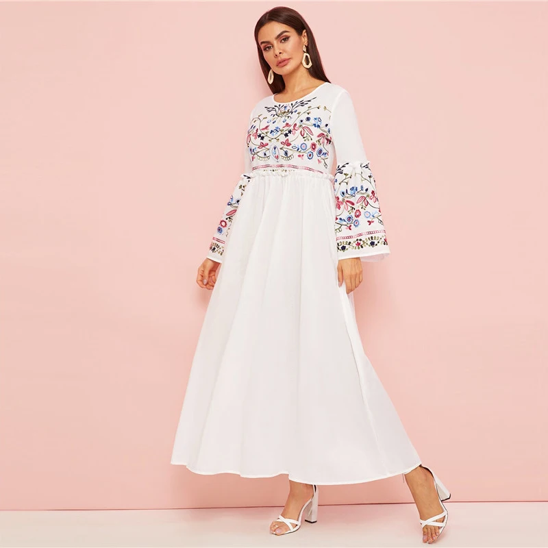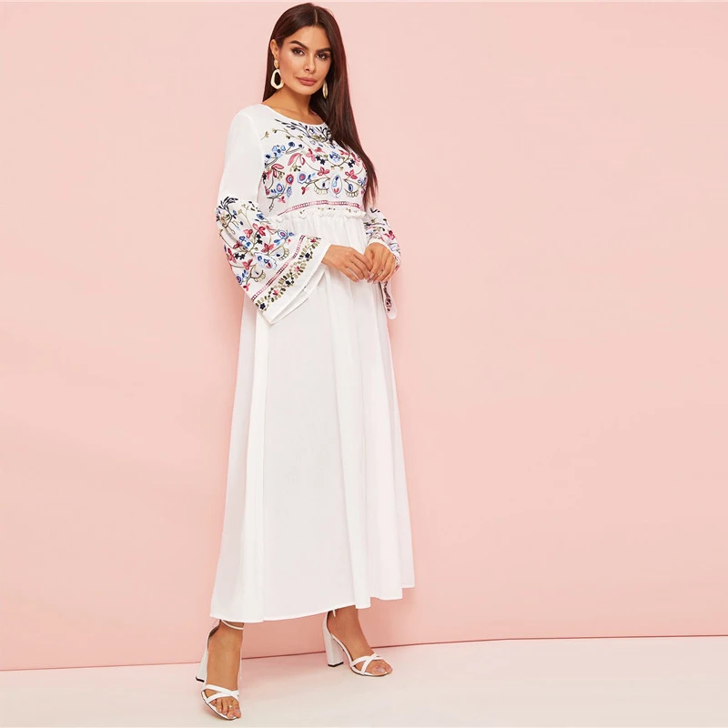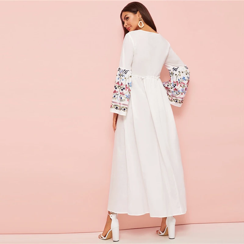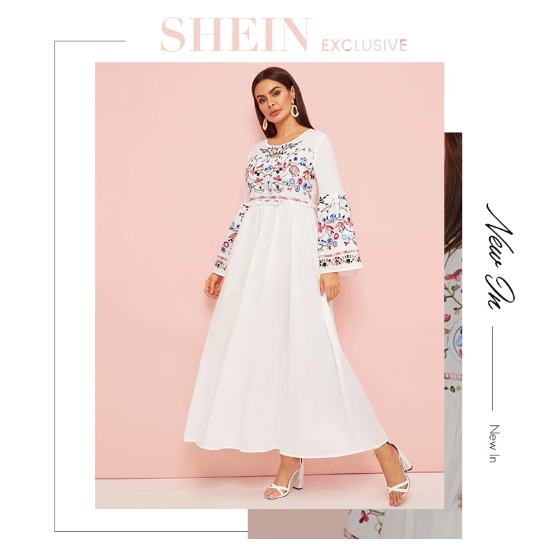SHEIN Abaya Flower Embroidered Frilled Trim Bell Sleeve Dress Women Spring Autumn Maxi White Dress Loose A Line Elegant Dresses