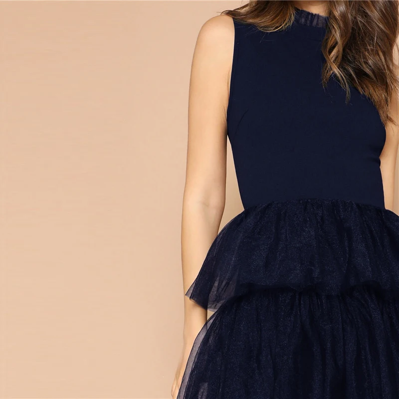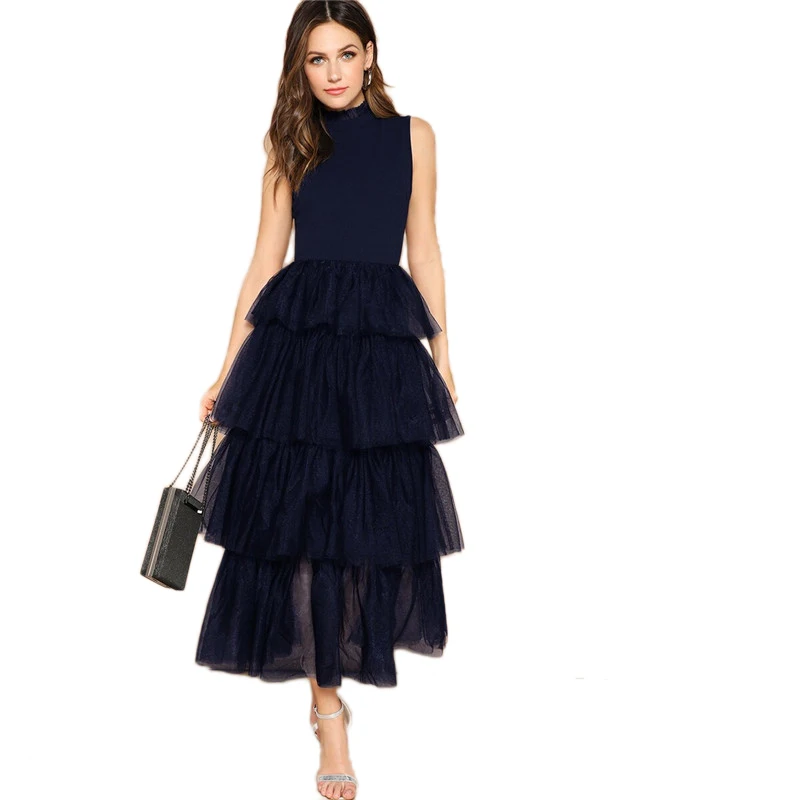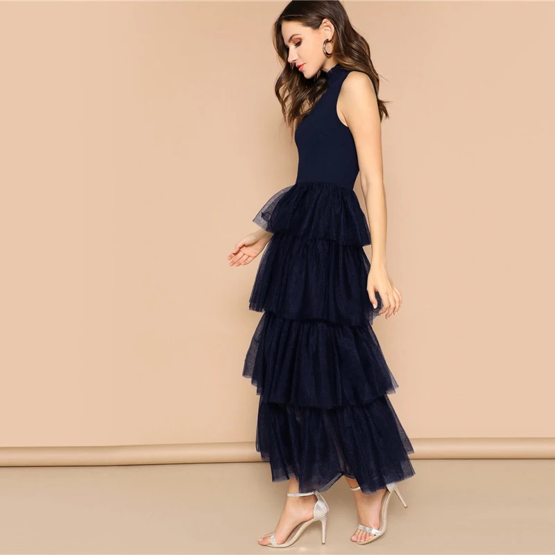 SHEIN Frilled Neckline Layered Mesh Ruffle Hem Maxi Dress Sleeveless Stand Collar Glamorous Party Dress High Waist Summer Dress