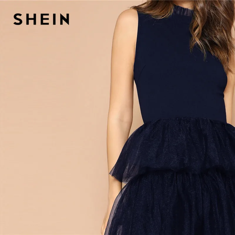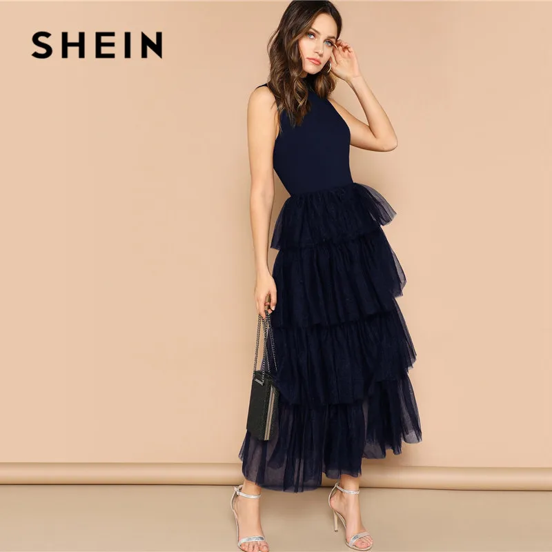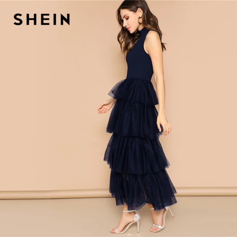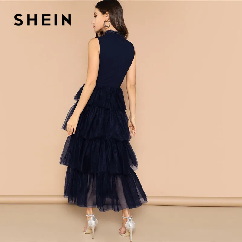 SHEIN Frilled Neckline Layered Mesh Ruffle Hem Maxi Dress Sleeveless Stand Collar Glamorous Party Dress High Waist Summer Dress