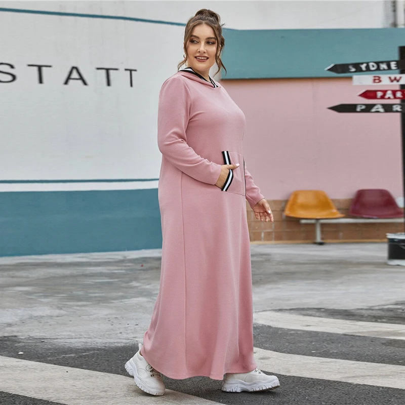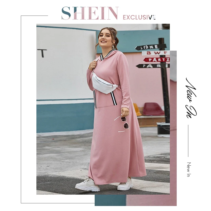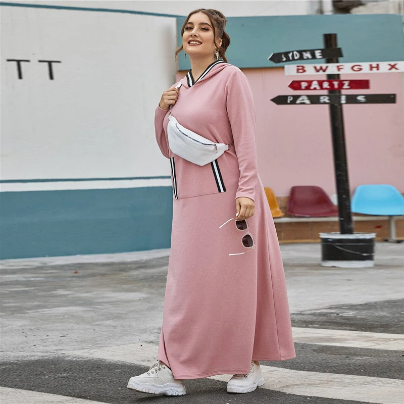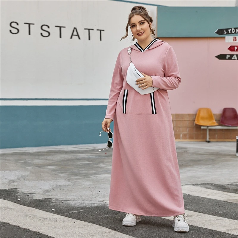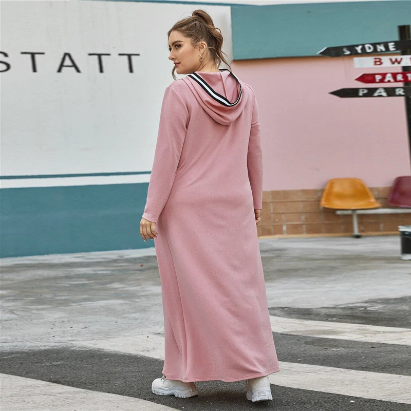 SHEIN Plus Size Pink Striped Trim Hooded Tee Dress Without Bag Women Spring Long Sleeve Plus Casual Straight Maxi Dresses