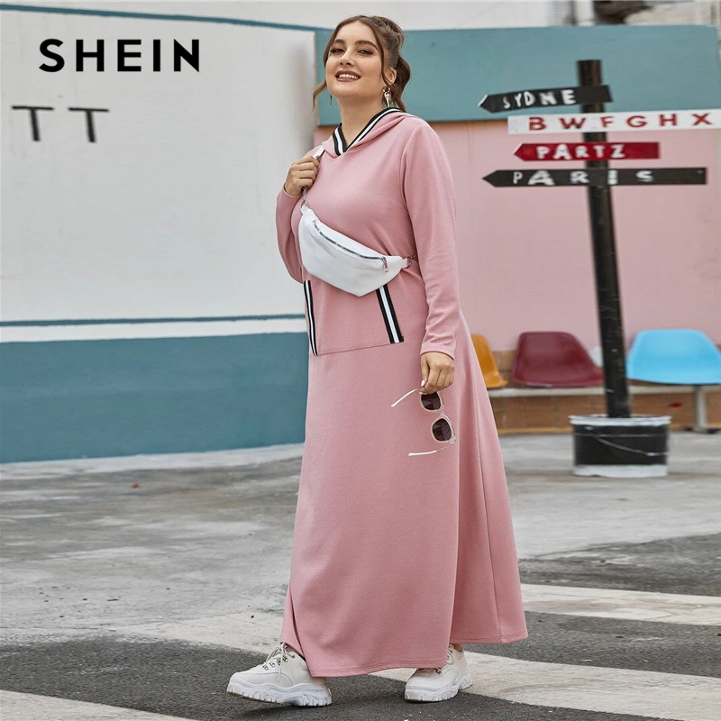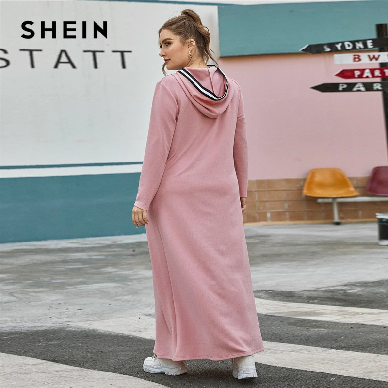 SHEIN Plus Size Pink Striped Trim Hooded Tee Dress Without Bag Women Spring Long Sleeve Plus Casual Straight Maxi Dresses