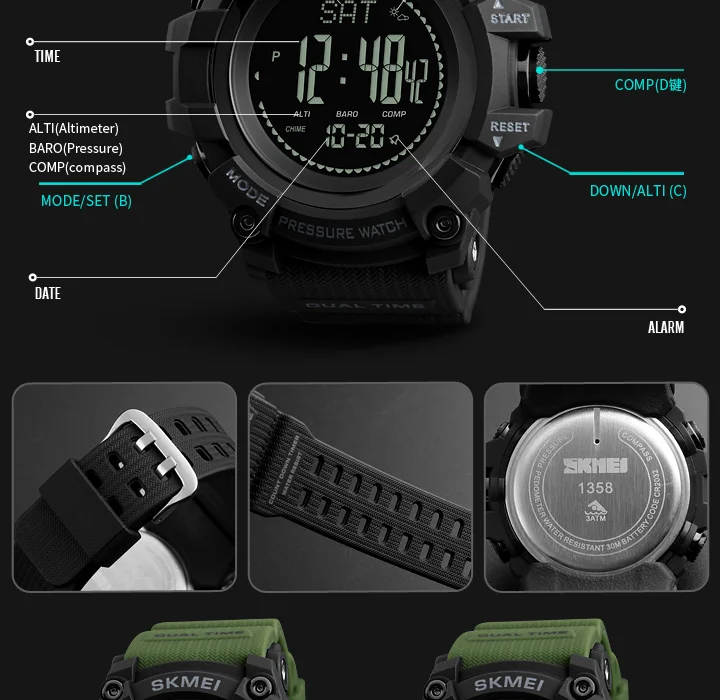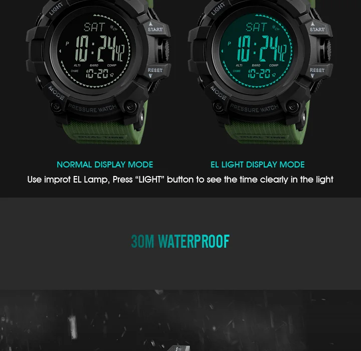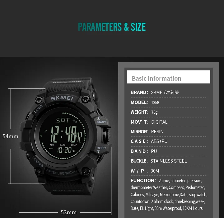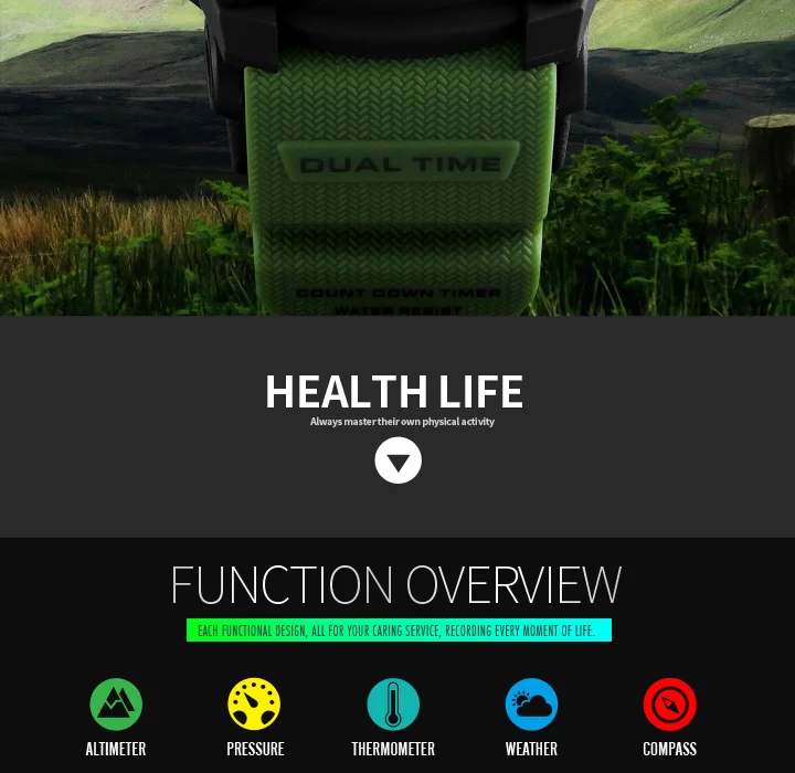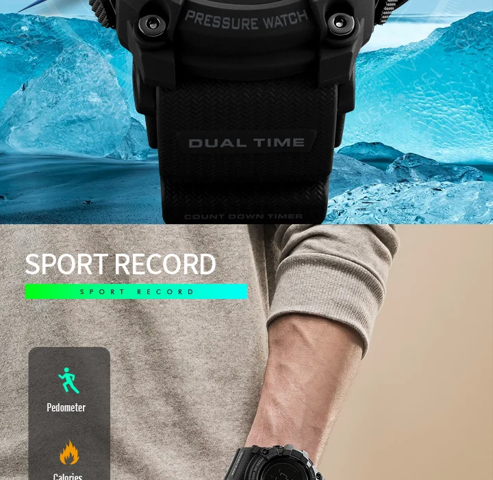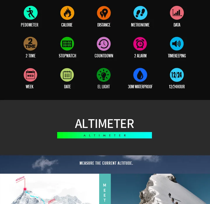 Functions: 2 time, altimeter, pressure, thermometer, weather, compass, pedometer, calories, mileage, metronome, data, stopwatch, countdown, 2 alarm clock, timekeeping, week, date, EL light, 30m waterproof, 12/24 hours