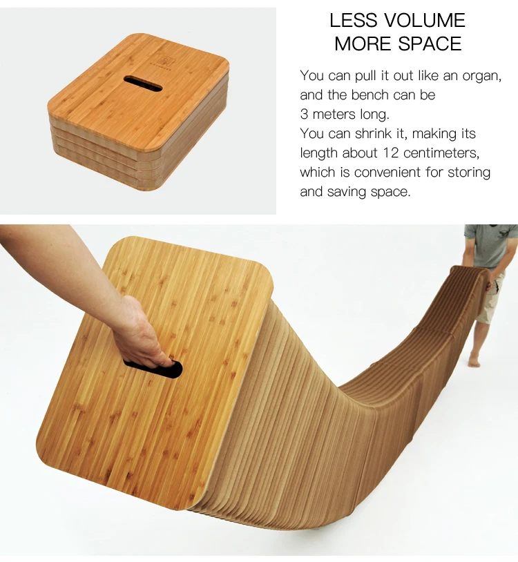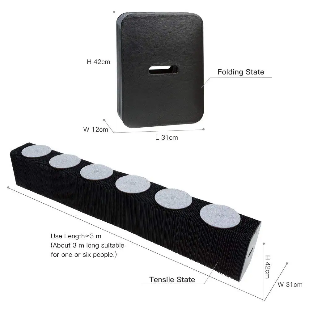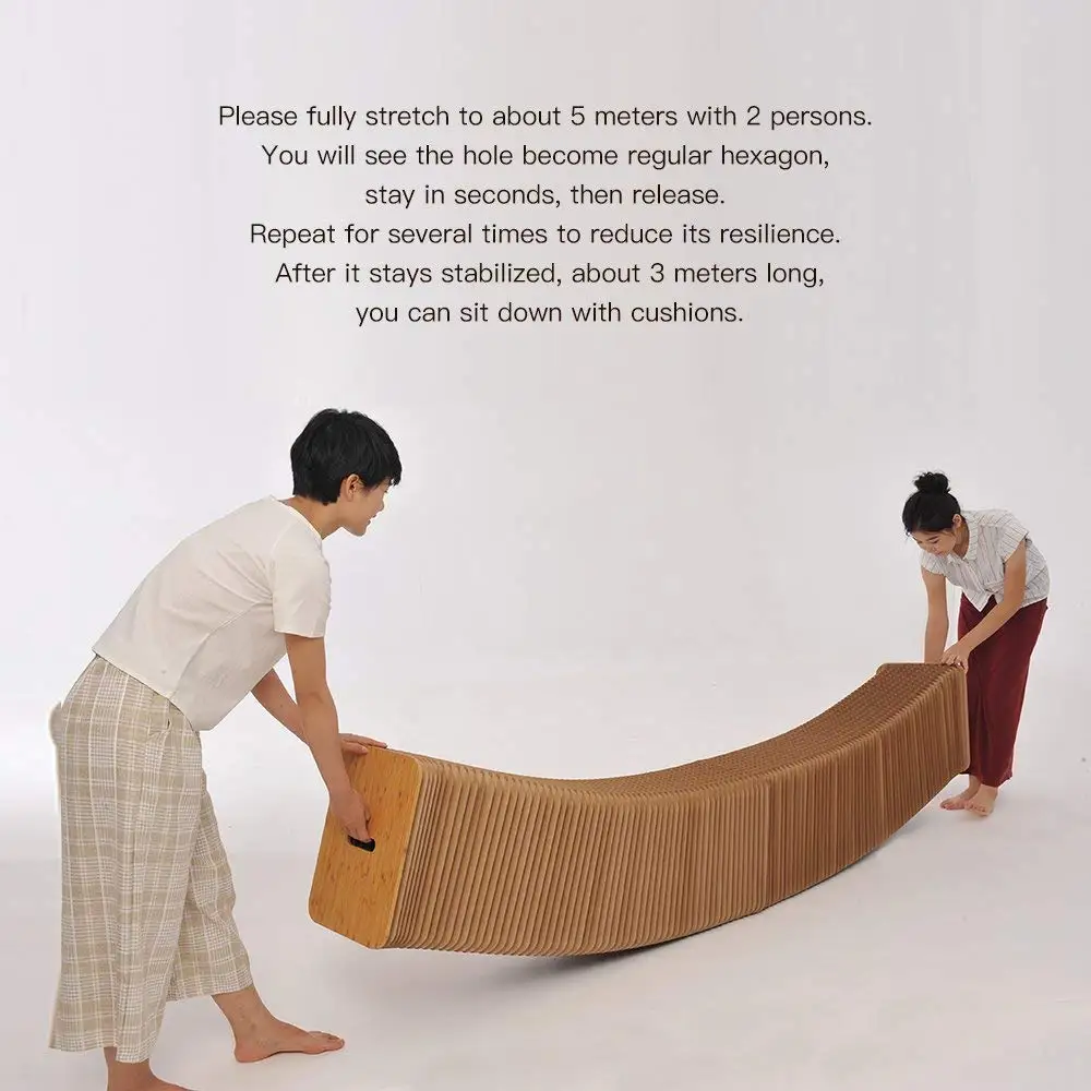 1) Please fully stretch about five meters with two persons, you can see the hole of the bench becomes hexagon. 2) Stay in seconds, then release, repeat for several times to reduce its resilience; 3) After it stays stabilized, about 3meters long, you can sit down with cushions; Kindly notes: 1) Please fully stretch the bench out, you can open the benches boldly.