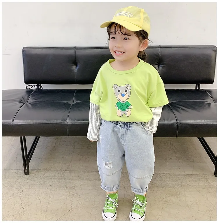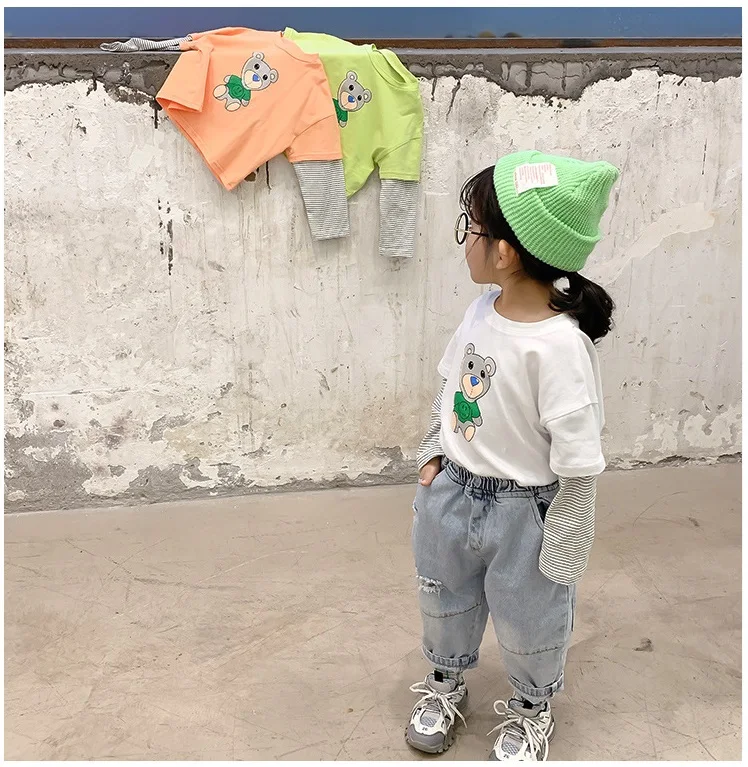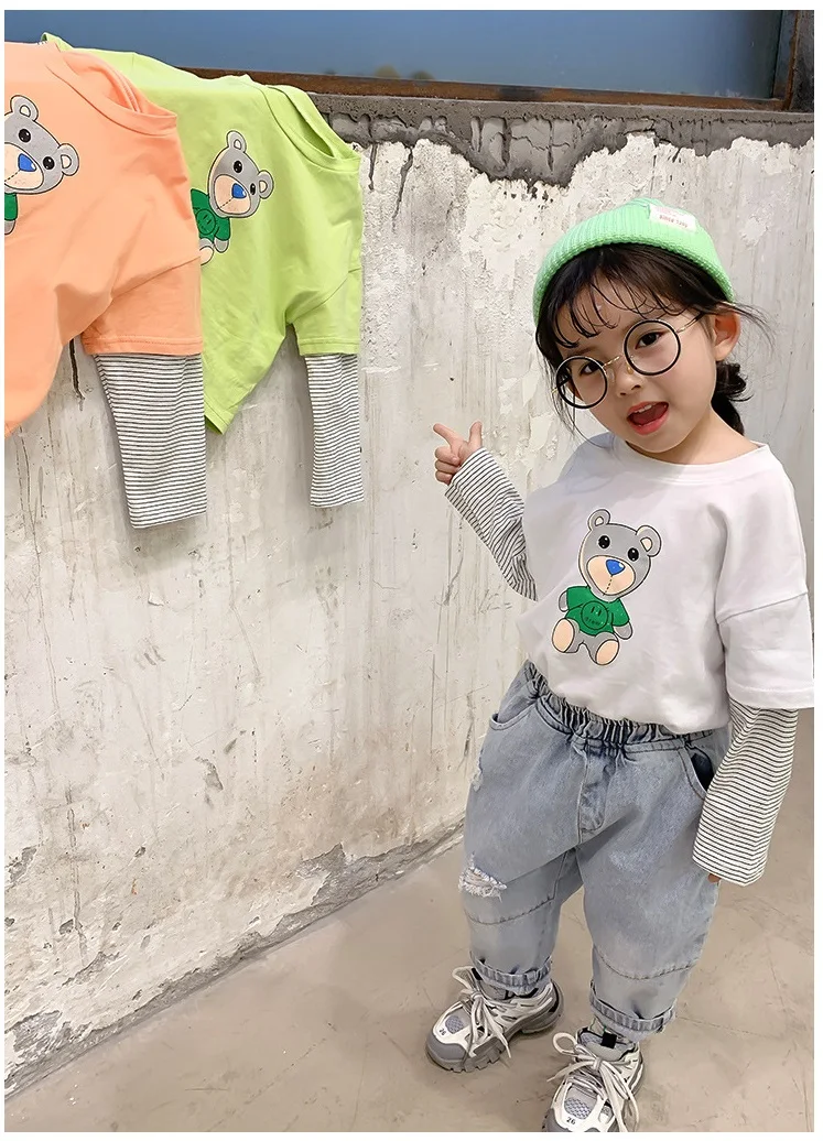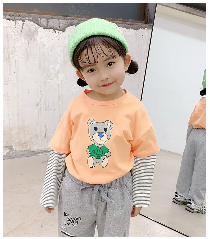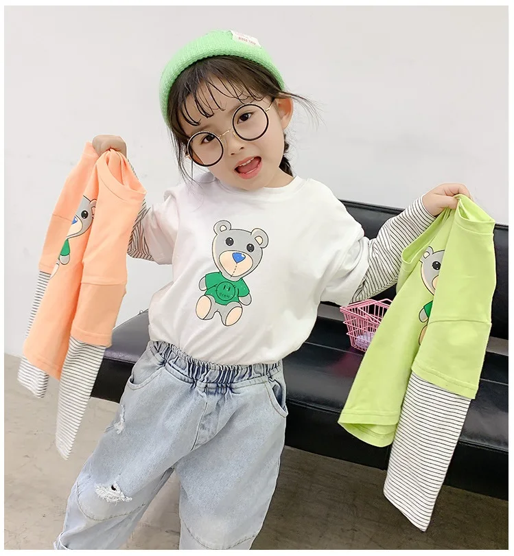 Spring new girls middle school children baby girls casual comfortable cartoon bear print round neck long sleeve fake two shirts