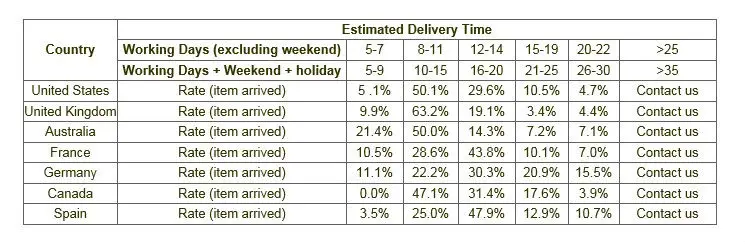 | Canada, Europe | 10-30 Business days |