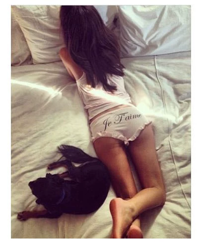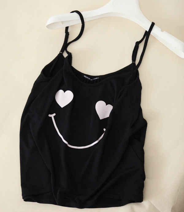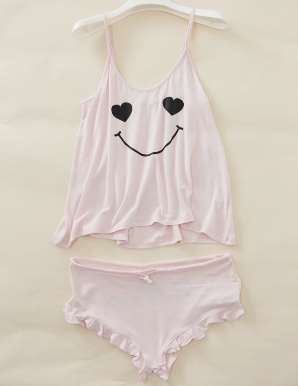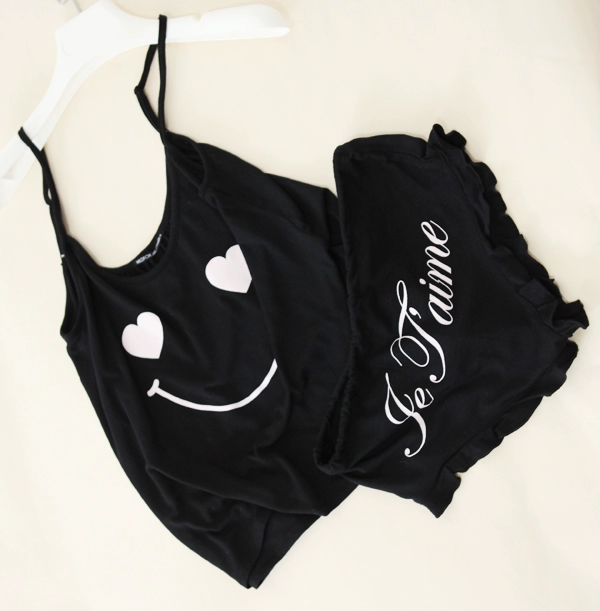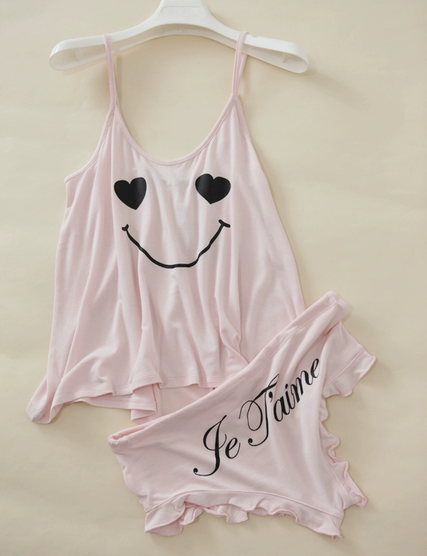 Sweet pajamas suit vest straps can be adjusted. Wind band tightening boy shorts, the front is a loving smile. Pants printed on the back French Je T’aime, which means I love you.
