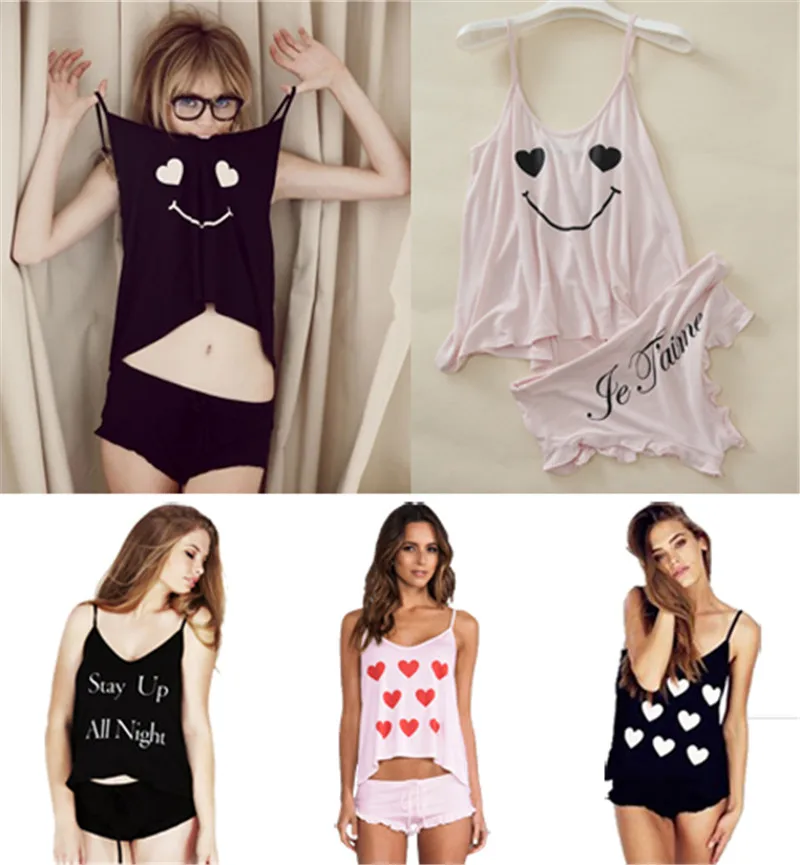 Sweet pajamas suit vest straps can be adjusted. Wind band tightening boy shorts, the front is a loving smile. Pants printed on the back French Je T’aime, which means I love you.