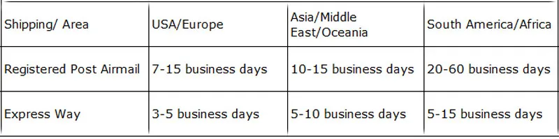1. Orders will ship out the next day after payment had been cleared, and the shipment can be ready by Netherlands Post, Singapore Post, EMS or DHL.