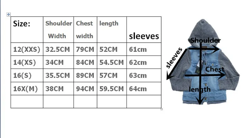 Size12 (XXS): shoulder width 32.5 cm , Chest width 79 cm , length 52 cm ,sleeve length 61 cm