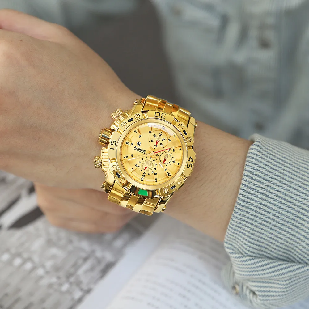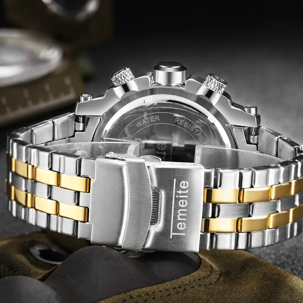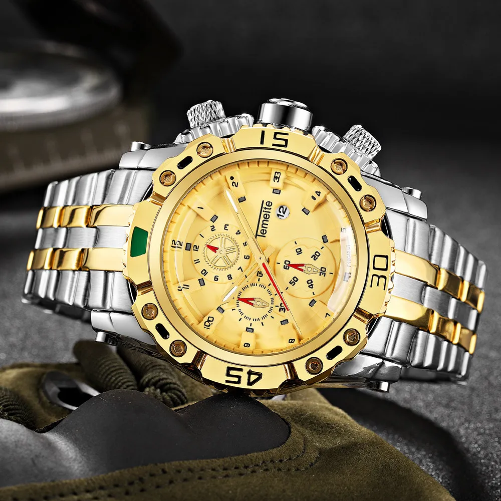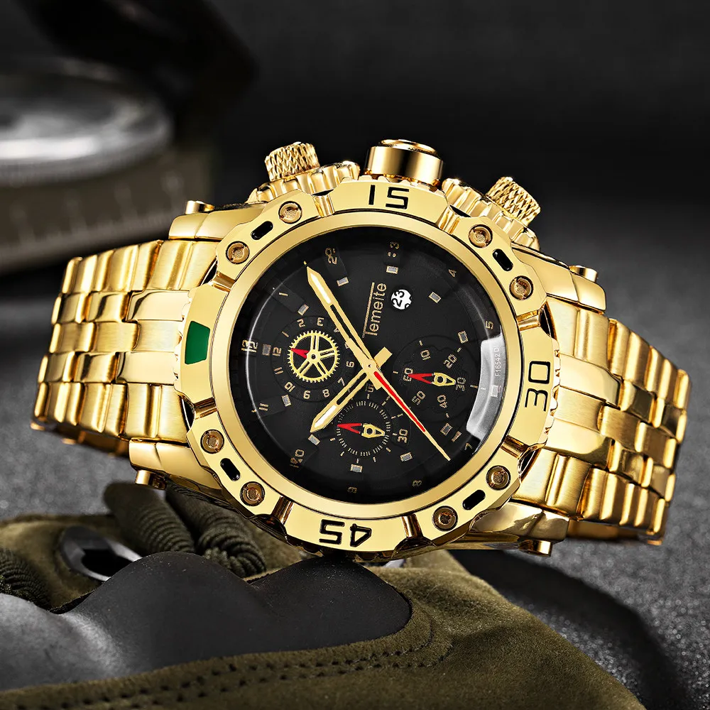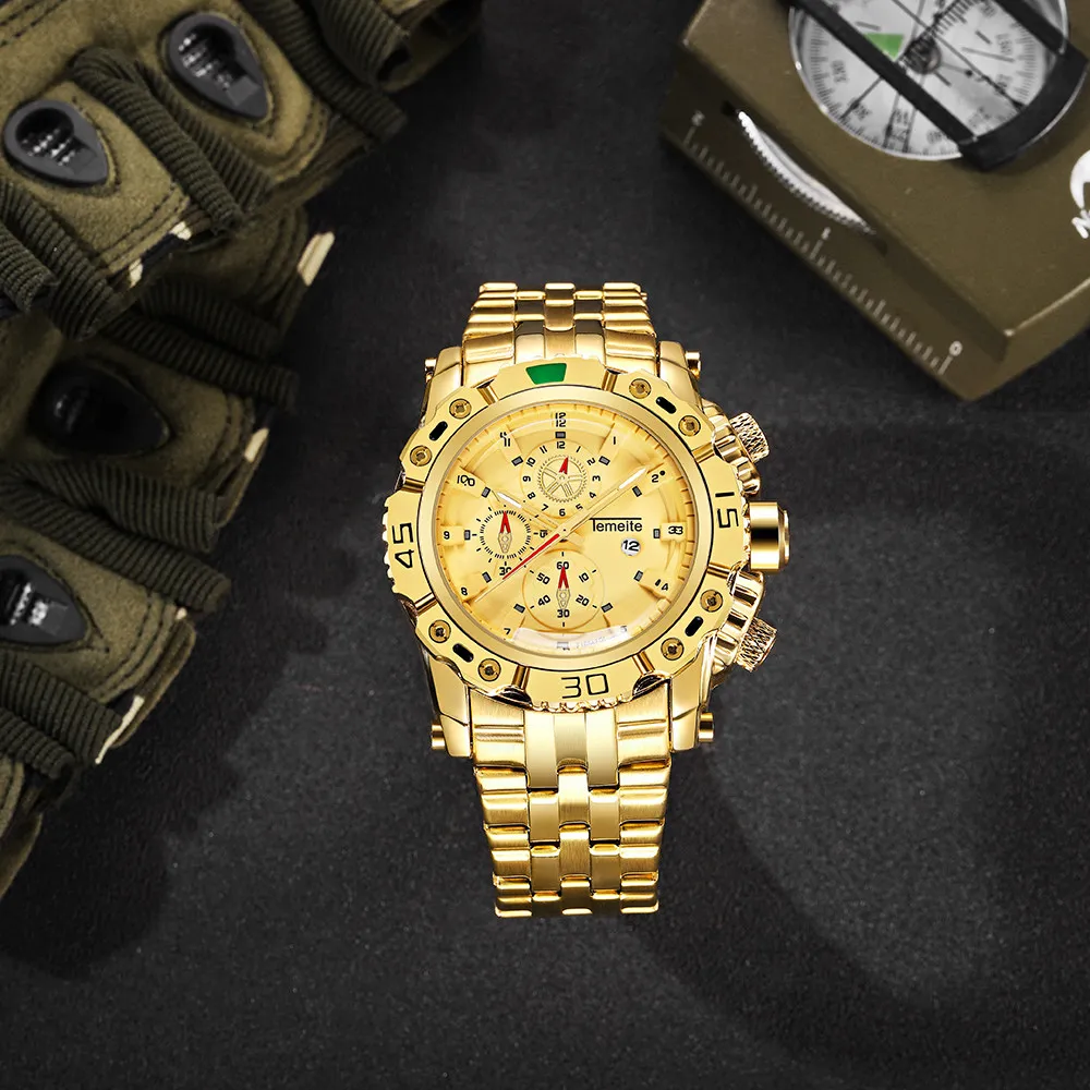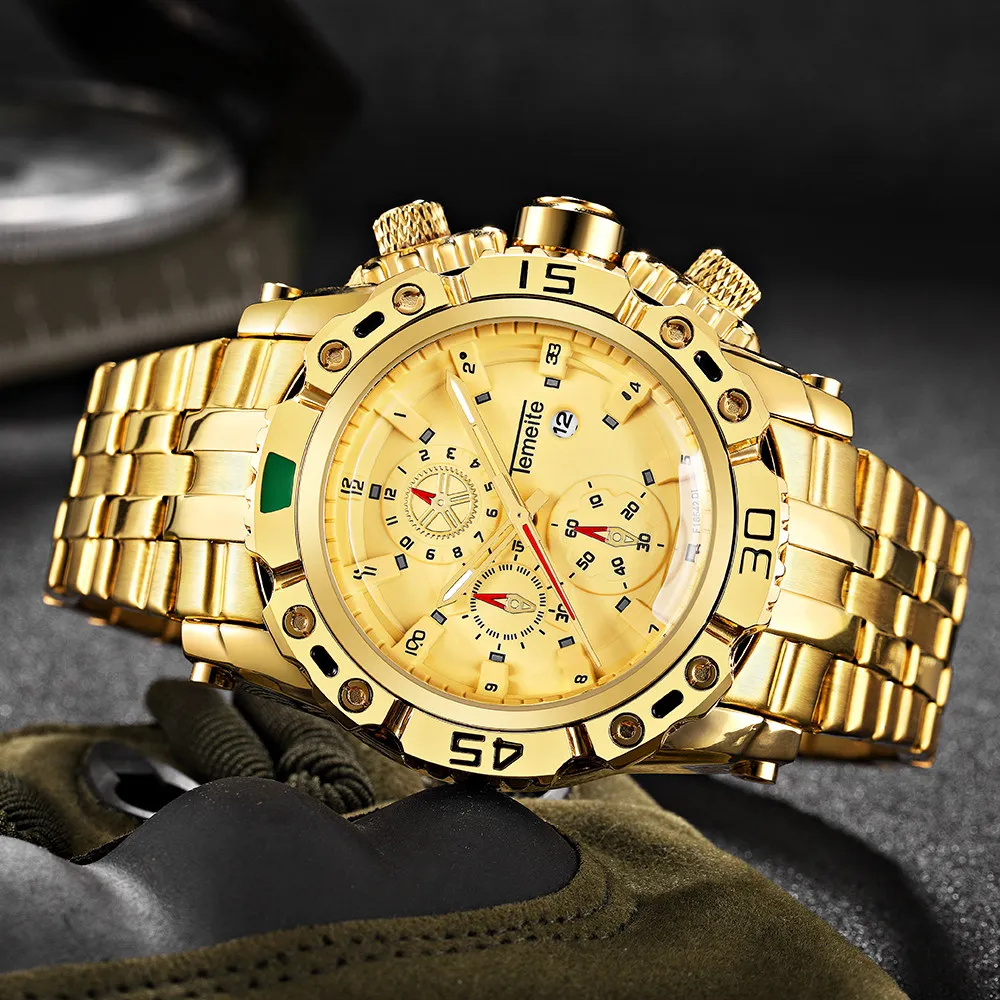 TEMEITE Creative Golden Men Quartz Wristwatches 3D Dial Design Full Steel Calendar Waterproof Big Watches Top Brand Luxury Clock