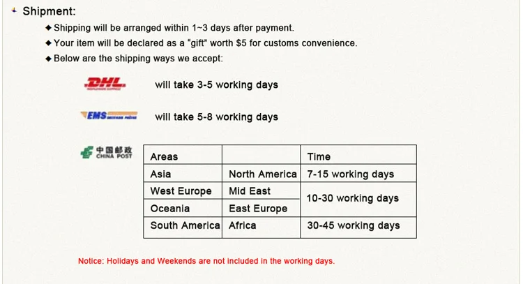 3.Middle East customers, please check your address, if you have P.O.BOX, please provide it to us, so that you can receive goods faster.