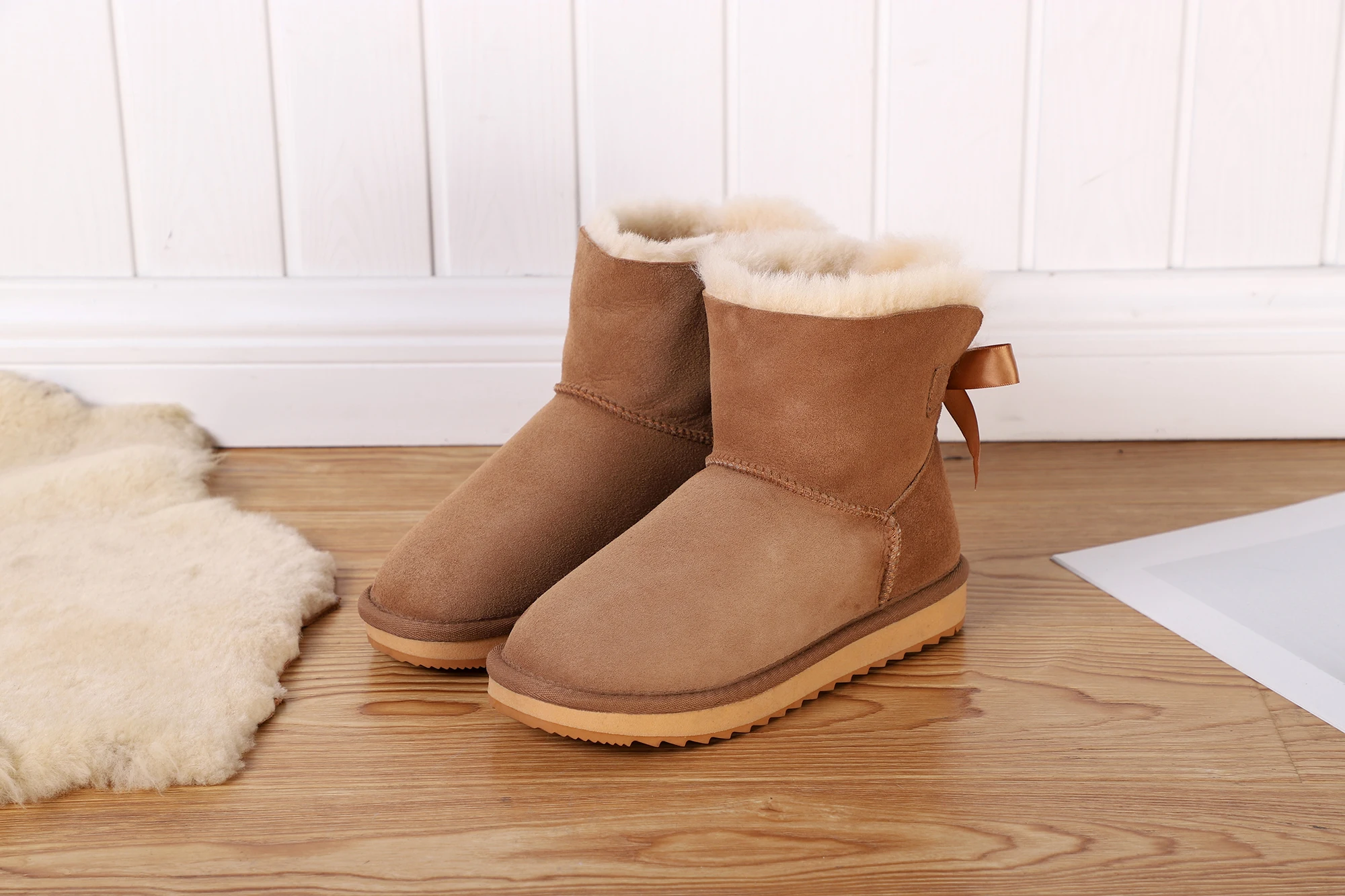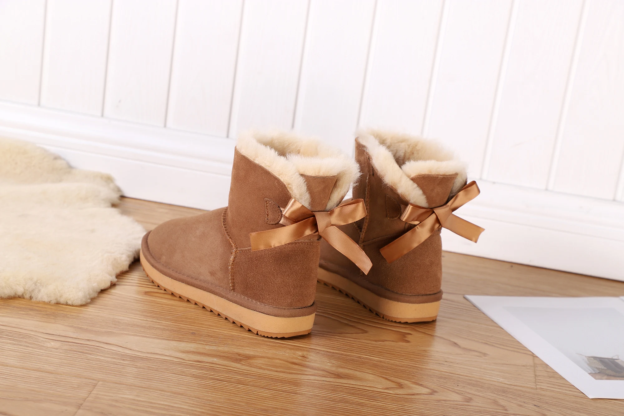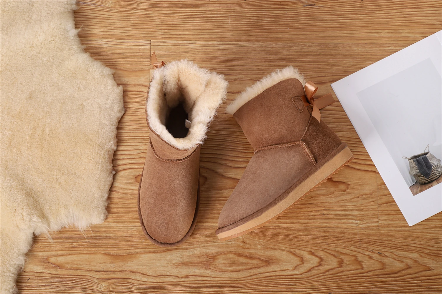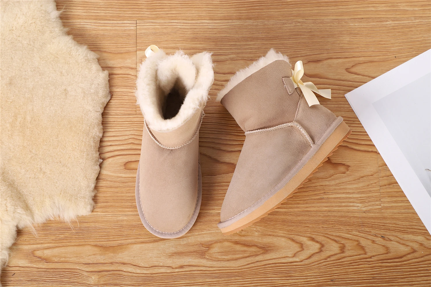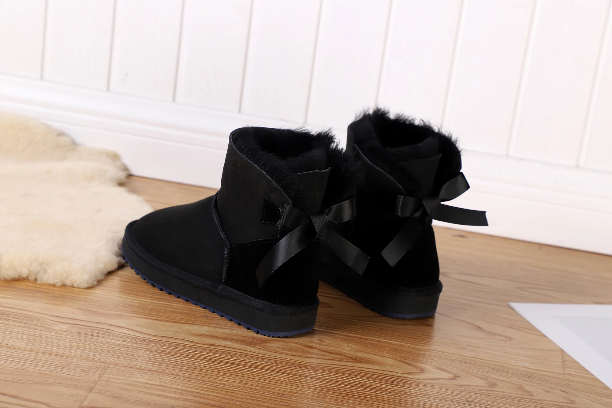 TPCR Sheepskin Leather Wool Fur Lined Women Short Ankle Winter Suede Snow Boots with Bowknots Mink Fur Tassels dusk Warm Shoes