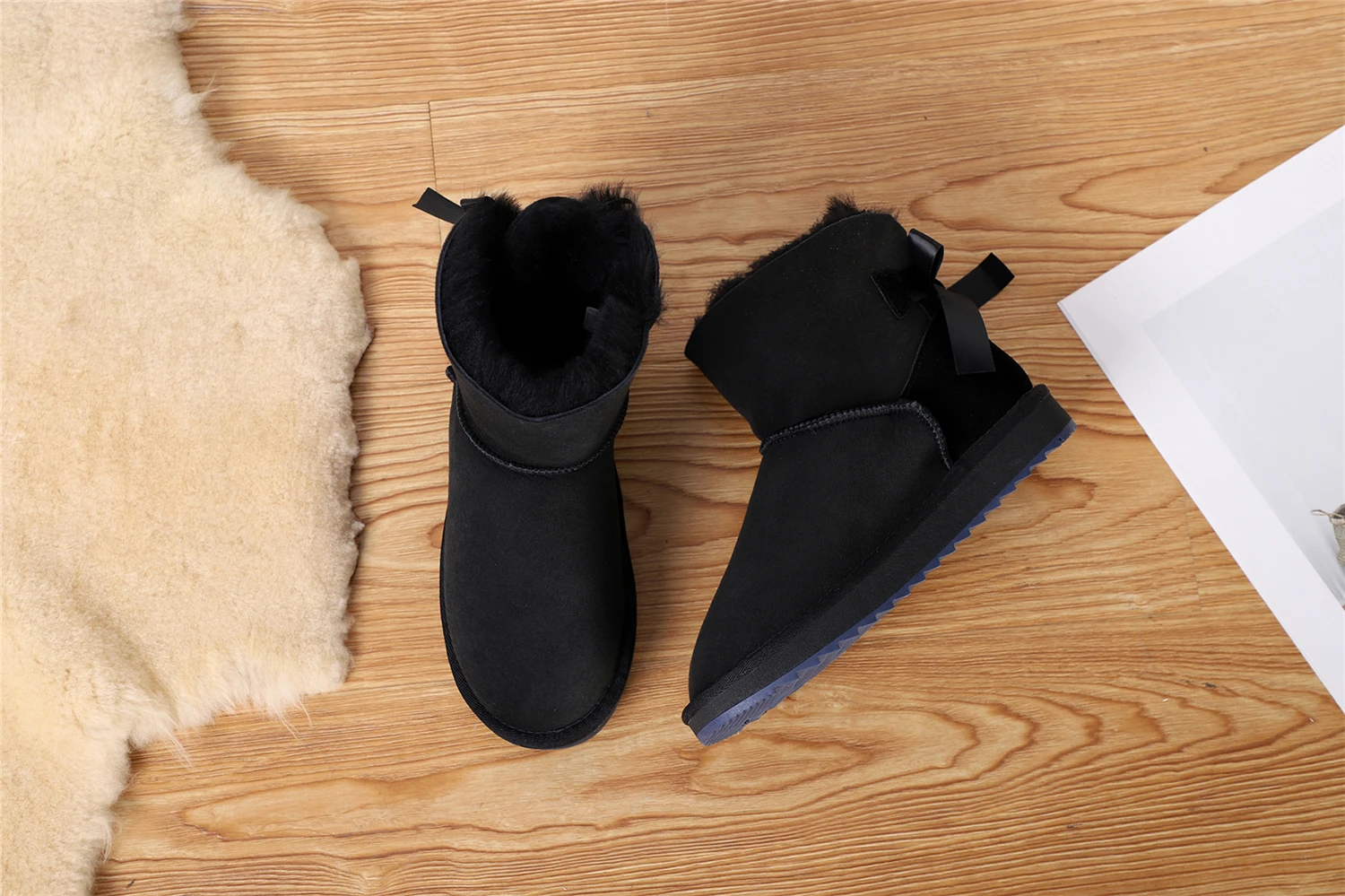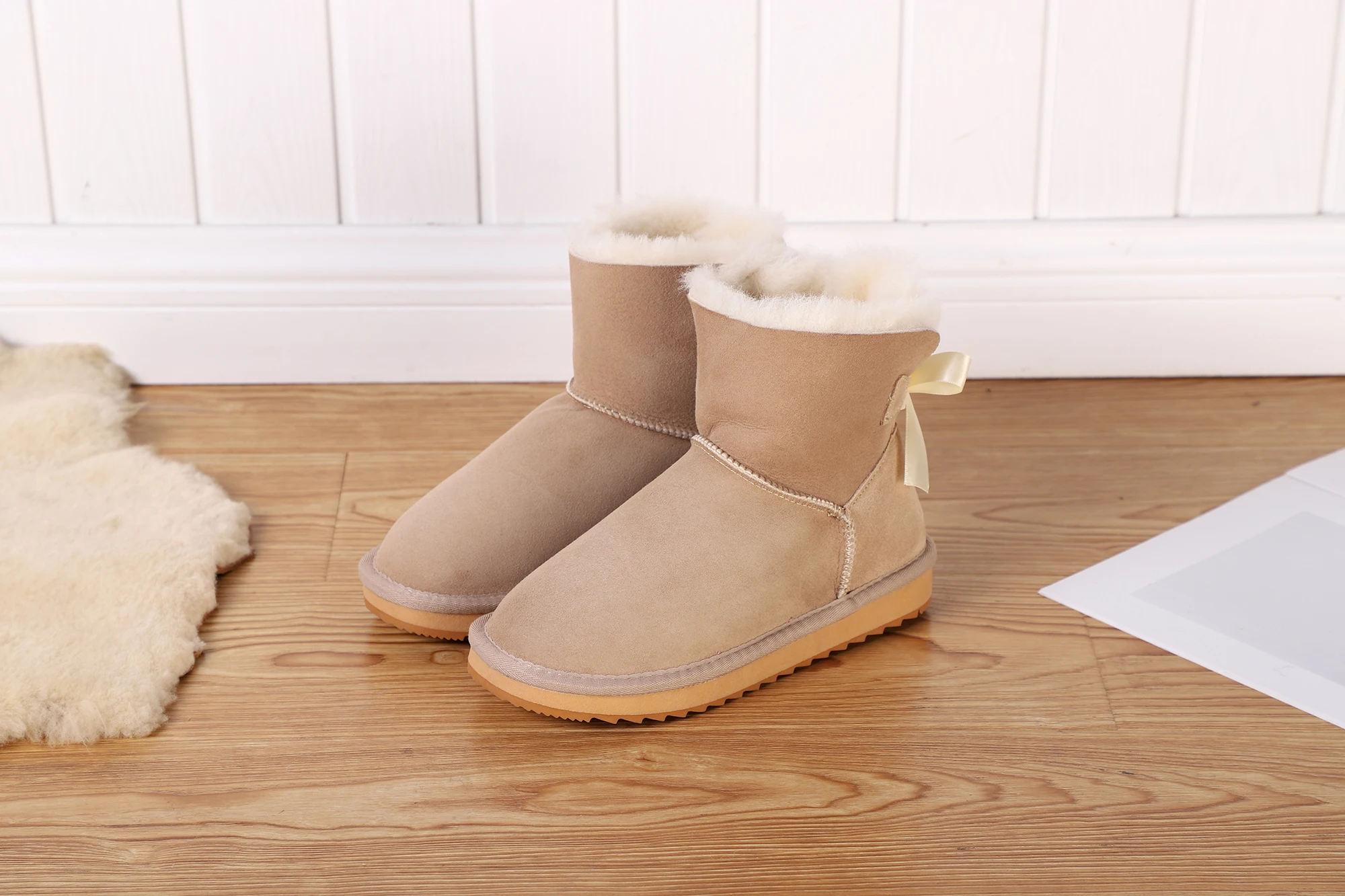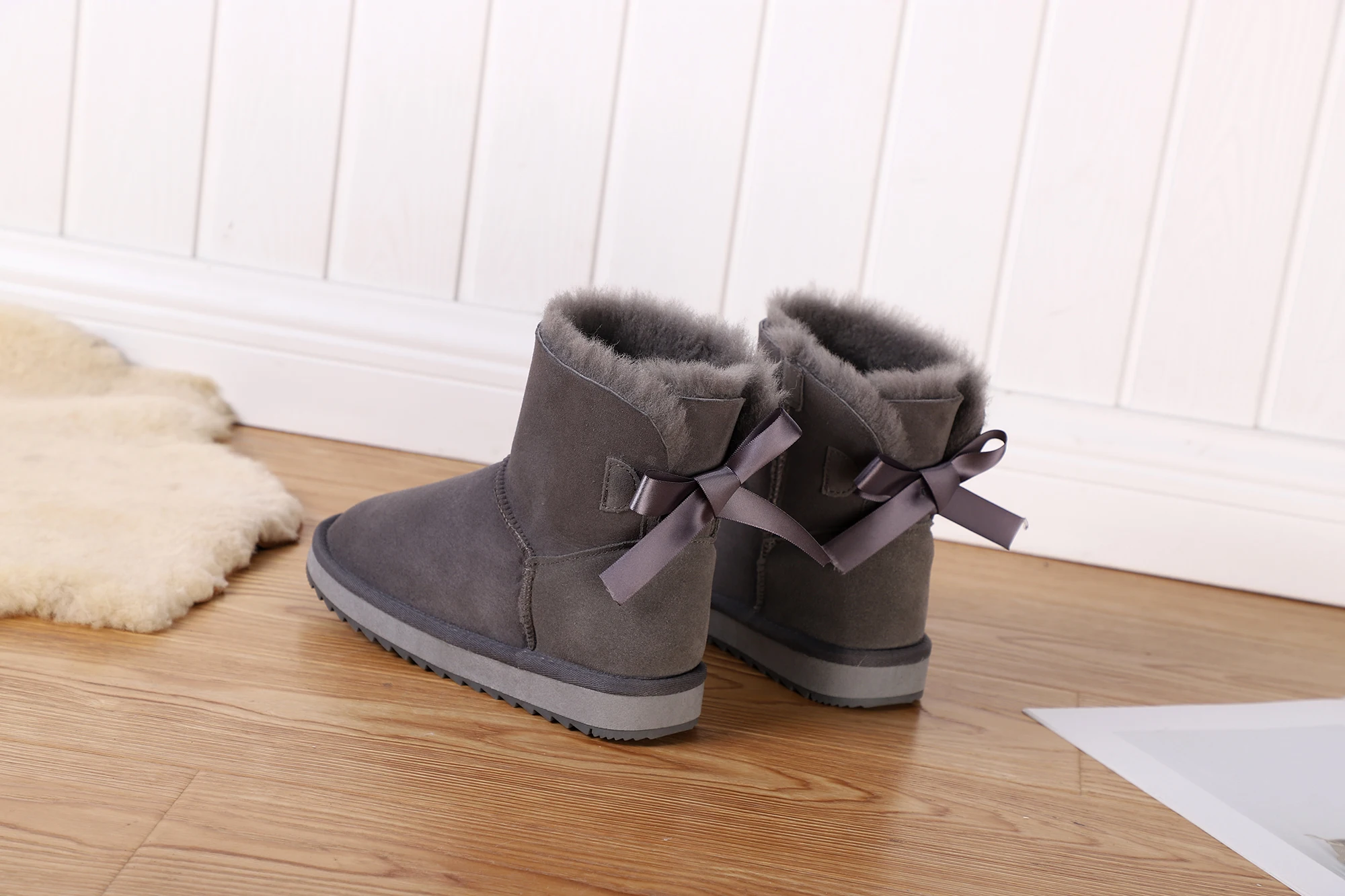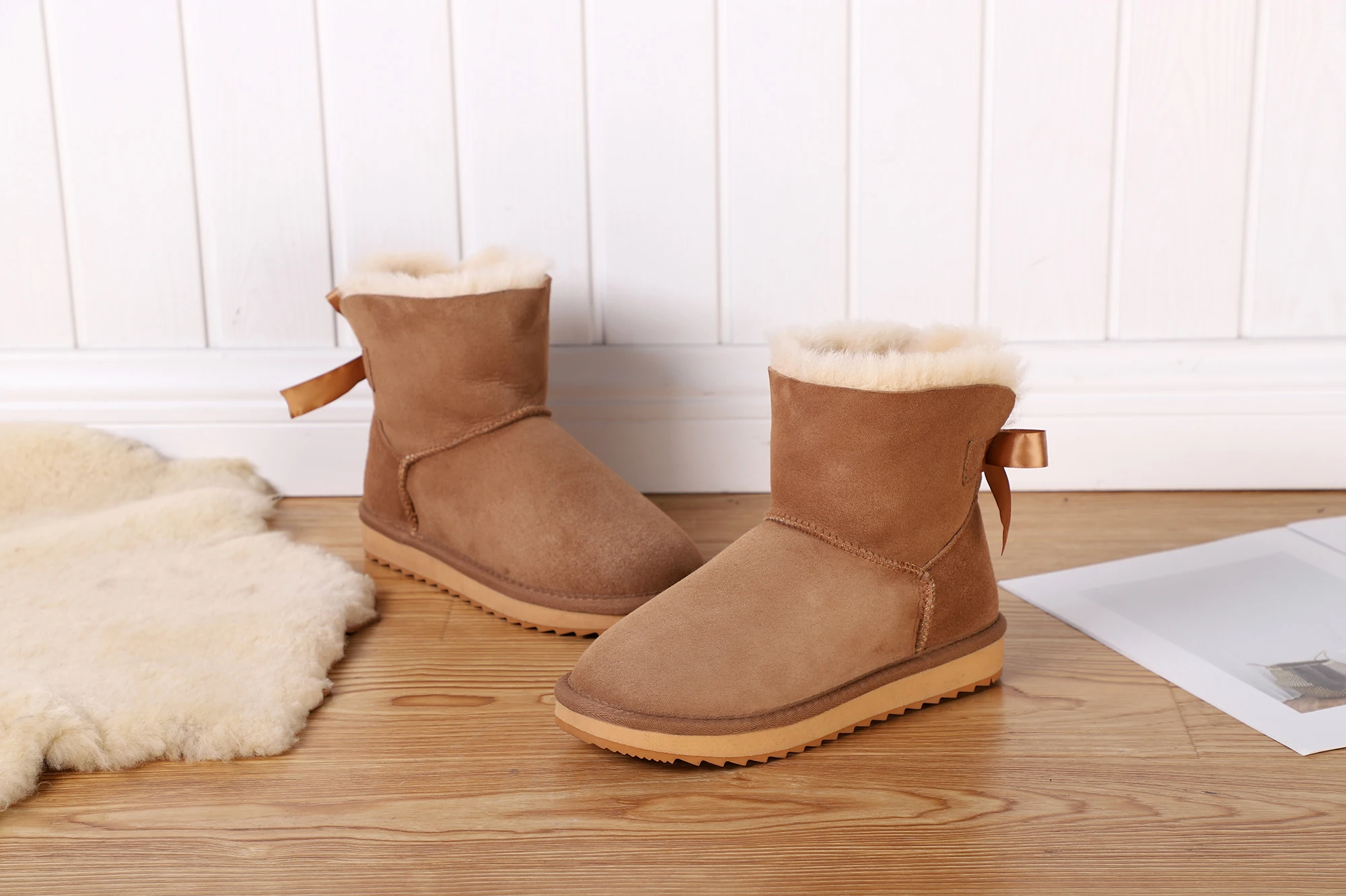 TPCR Sheepskin Leather Wool Fur Lined Women Short Ankle Winter Suede Snow Boots with Bowknots Mink Fur Tassels dusk Warm Shoes