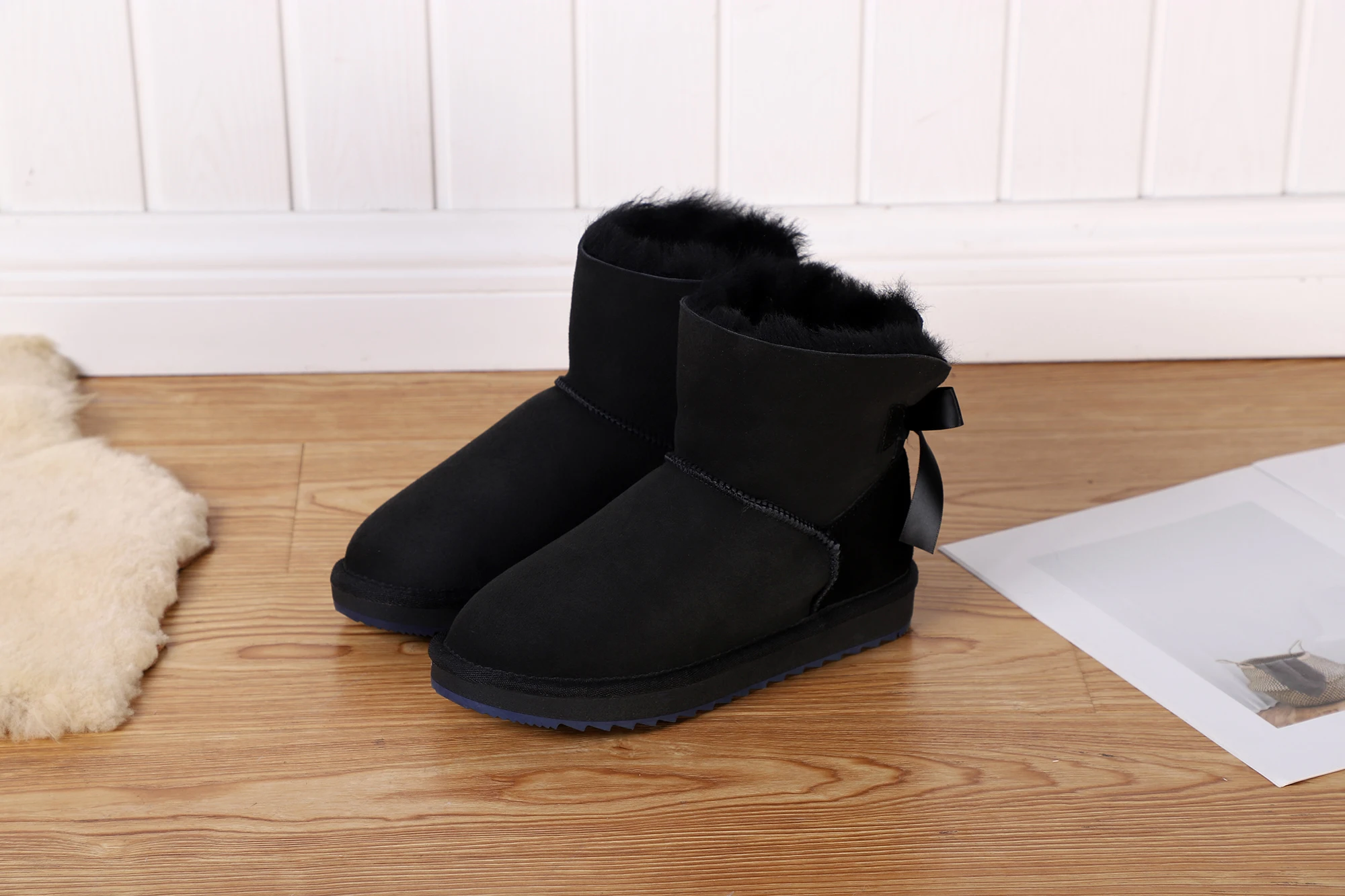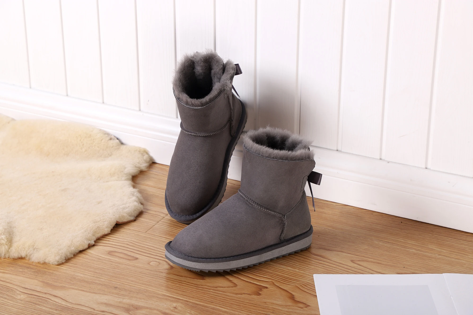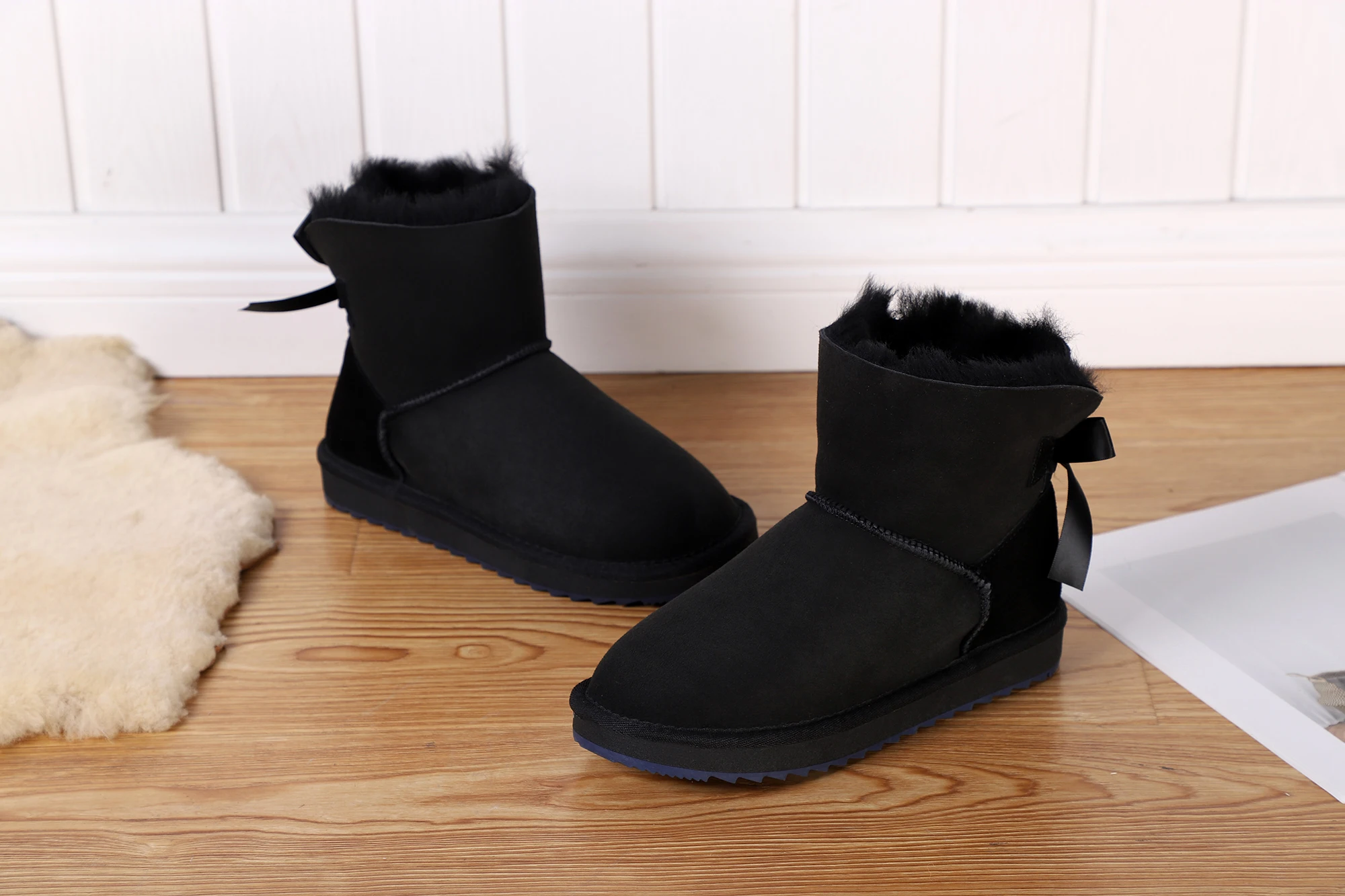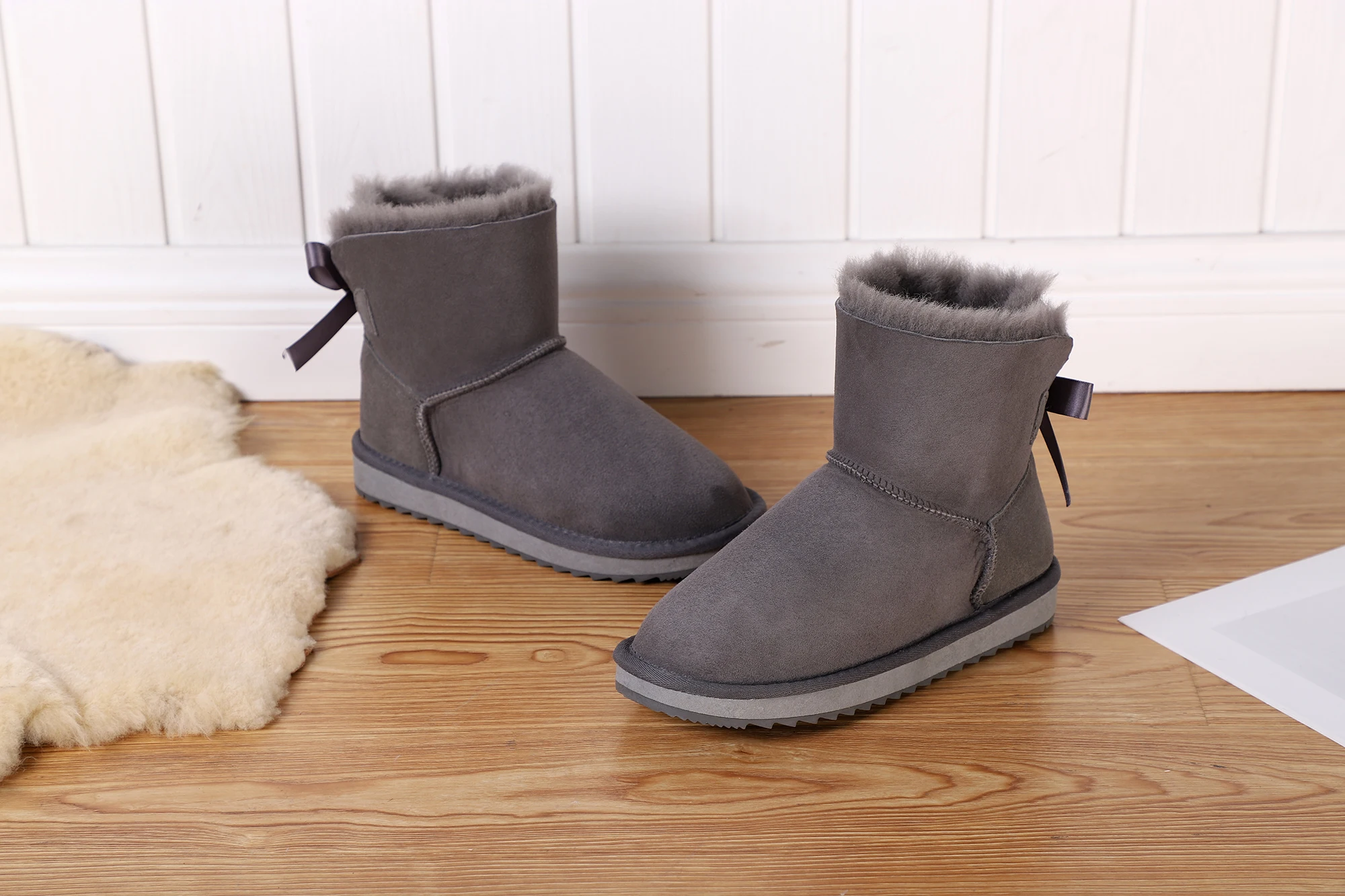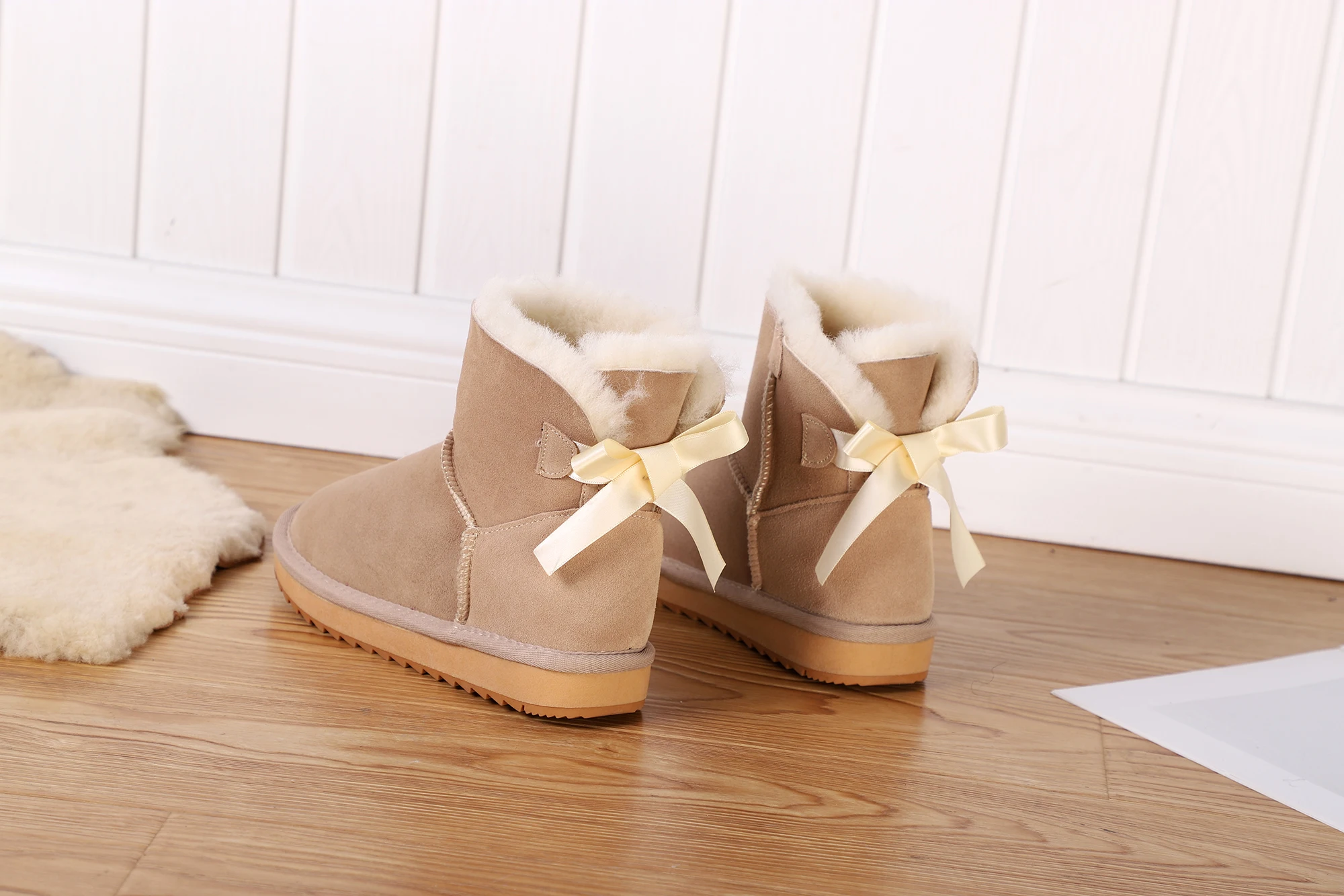 TPCR Sheepskin Leather Wool Fur Lined Women Short Ankle Winter Suede Snow Boots with Bowknots Mink Fur Tassels dusk Warm Shoes