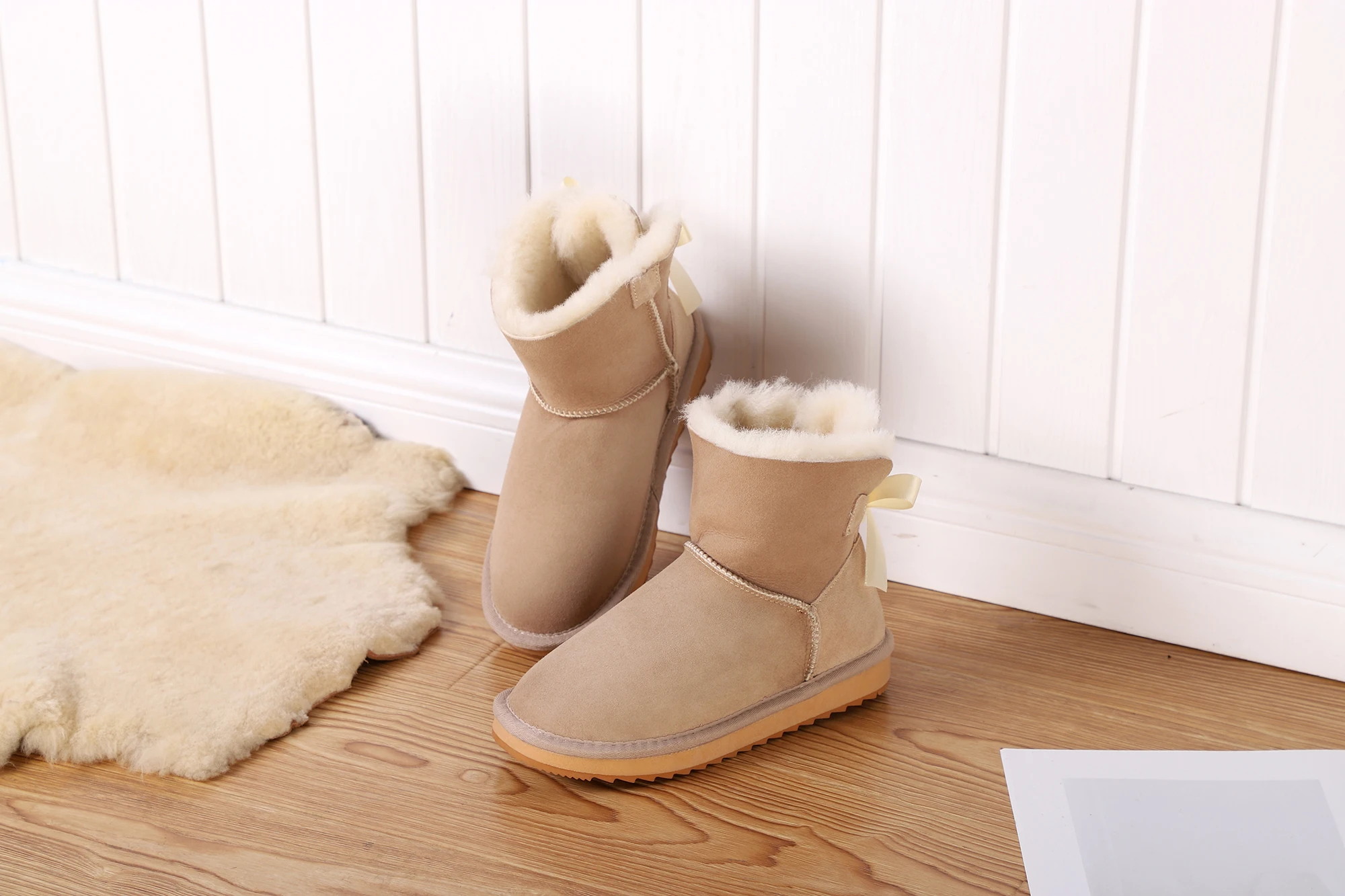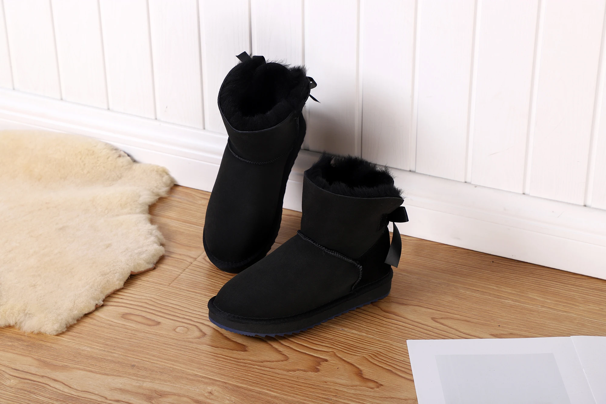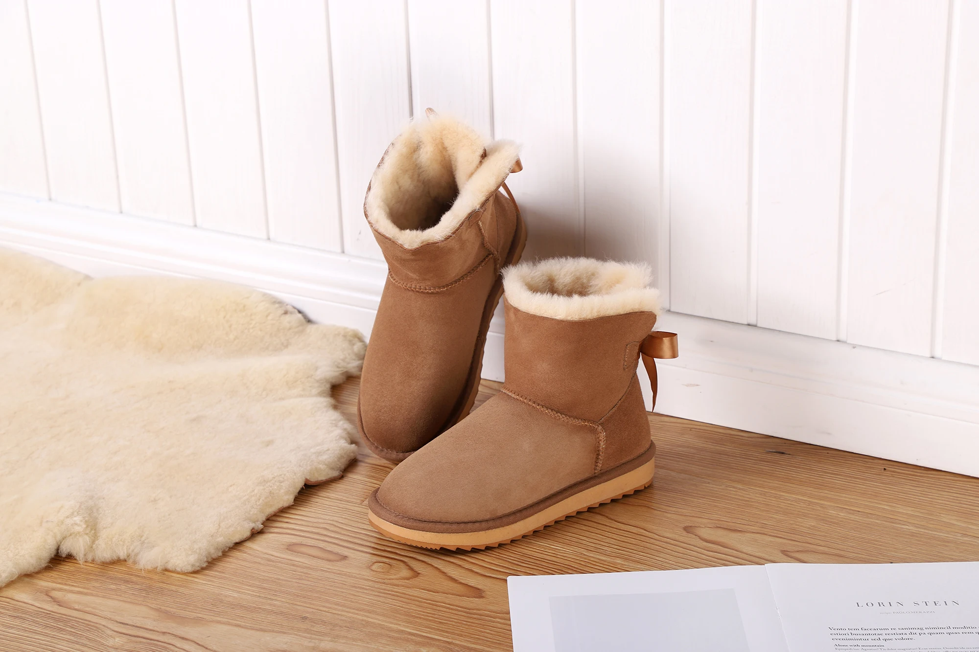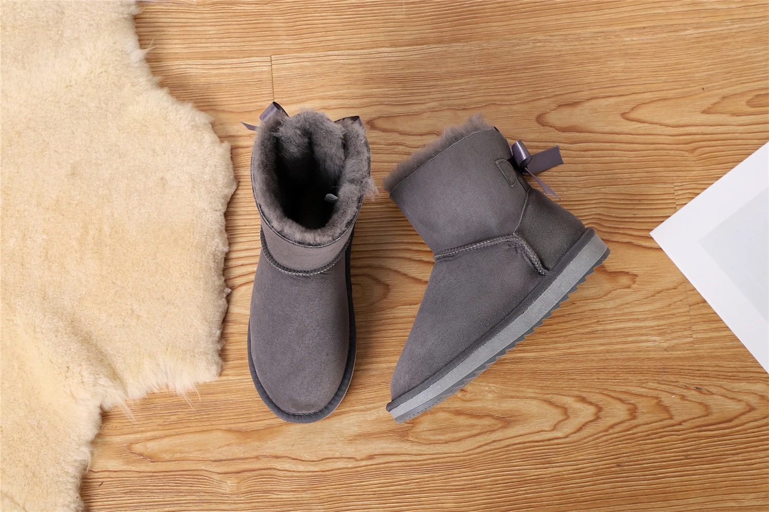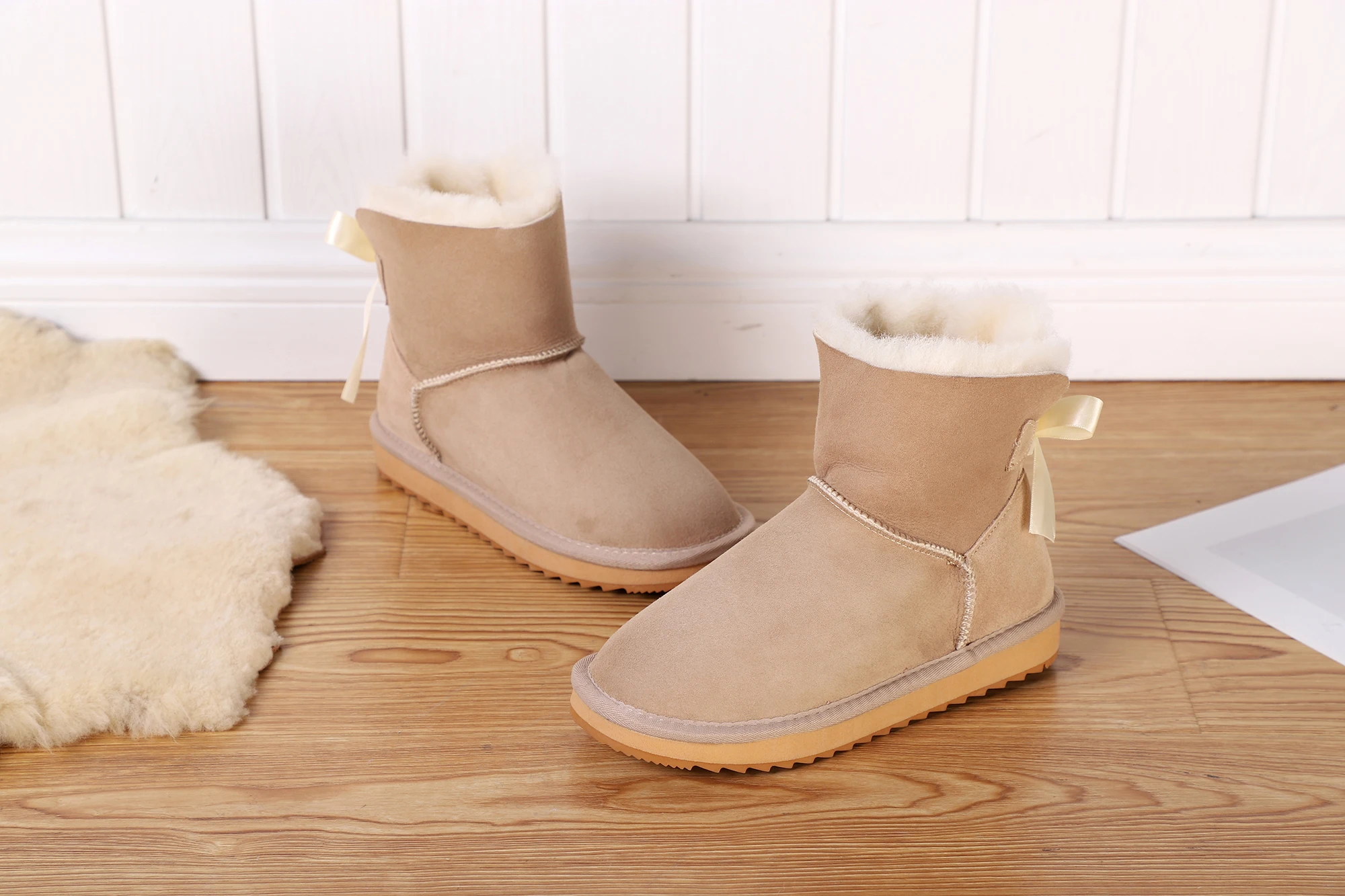 TPCR Sheepskin Leather Wool Fur Lined Women Short Ankle Winter Suede Snow Boots with Bowknots Mink Fur Tassels dusk Warm Shoes