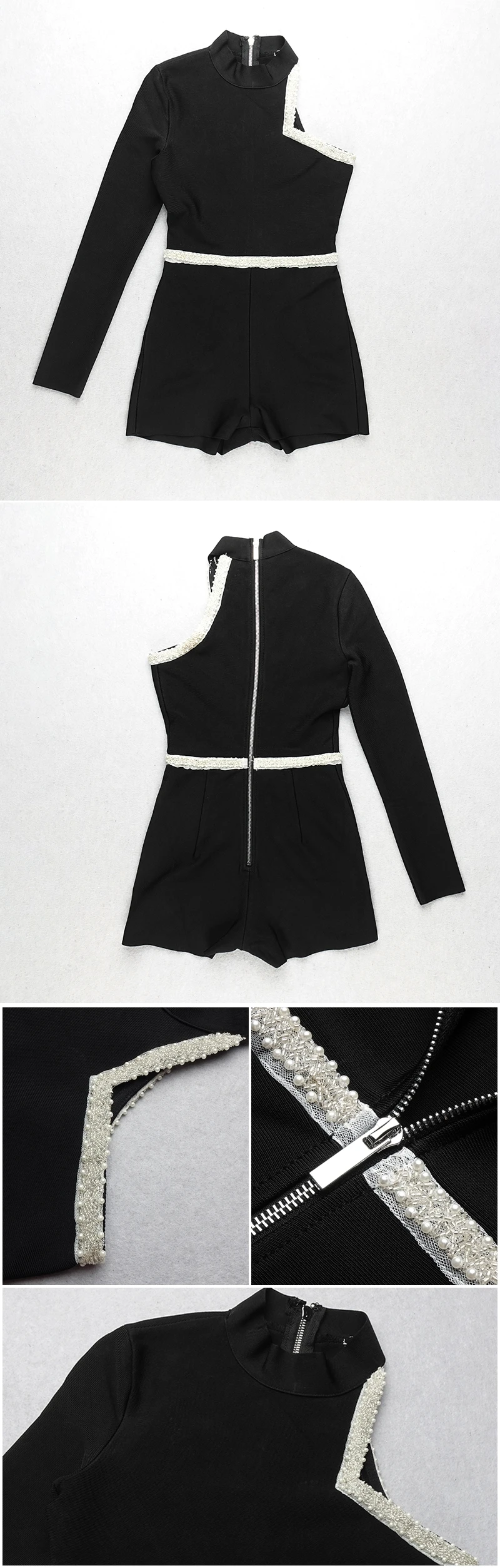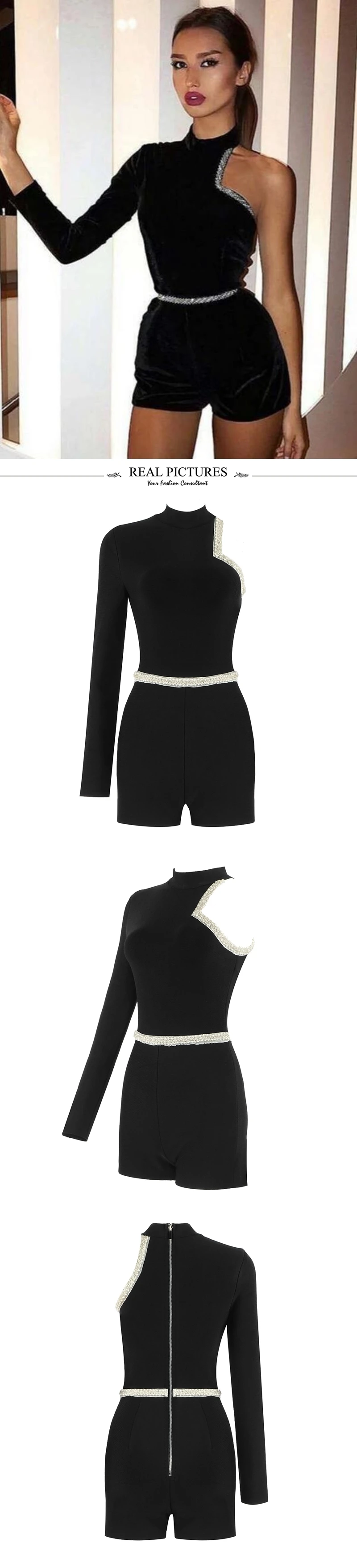 One Shoulder Long Sleeves Beads Embellished Celebrity Party Bandage Playsuit