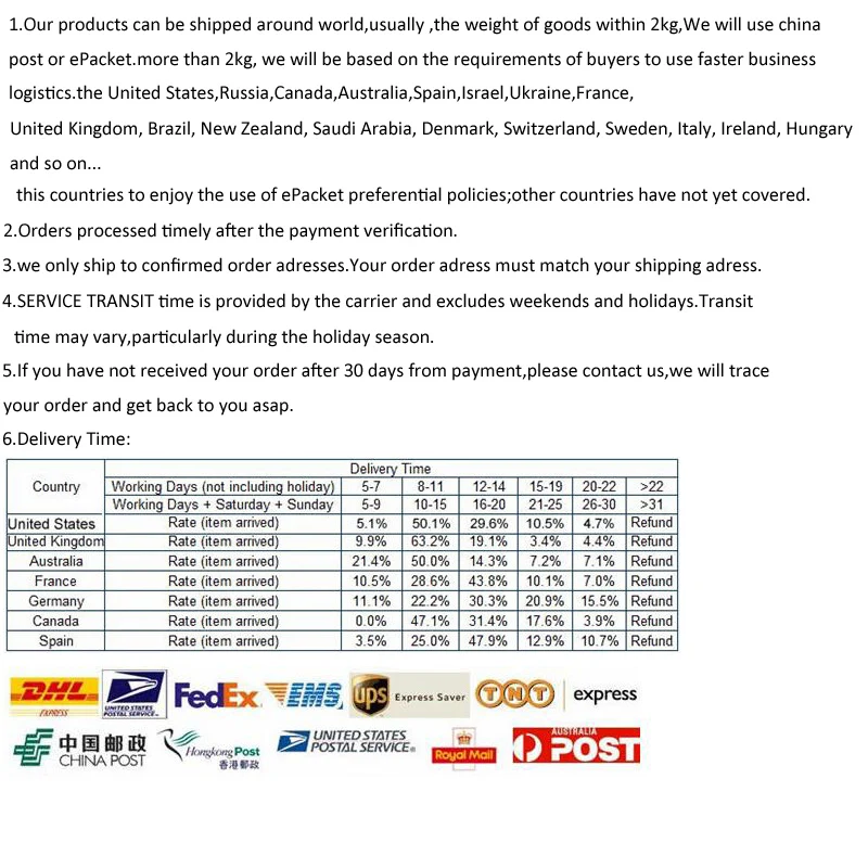Packages from our warehouse in China will be shipped by ePacket or EMS depending on the weight and size of the product. Packages shipped from our US warehouse are shipped through USPS.