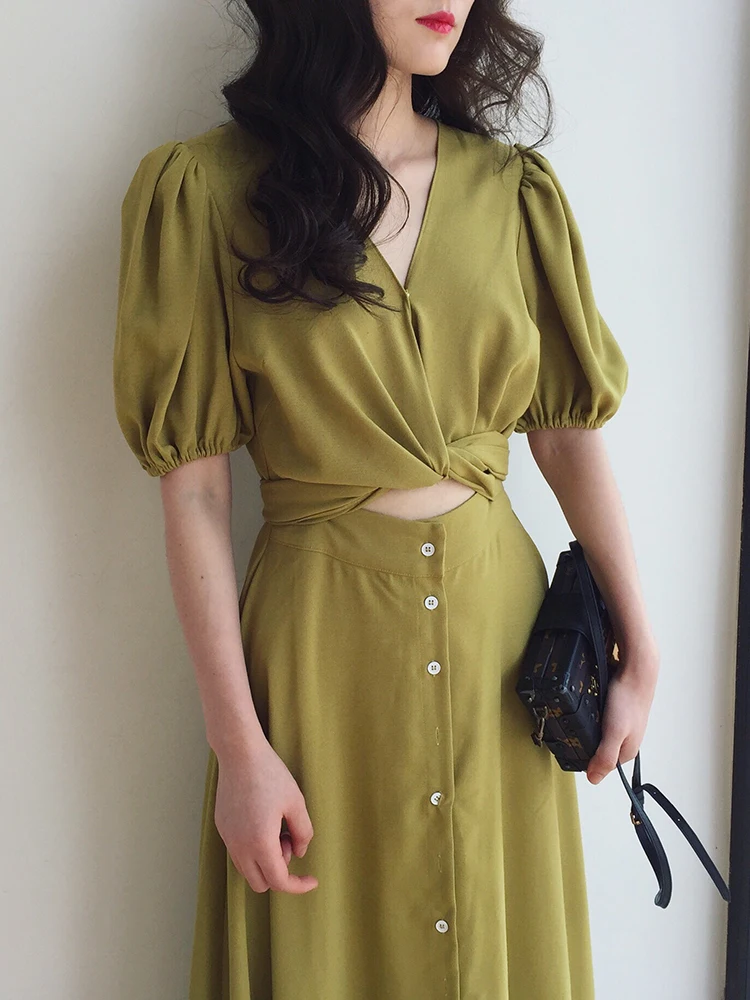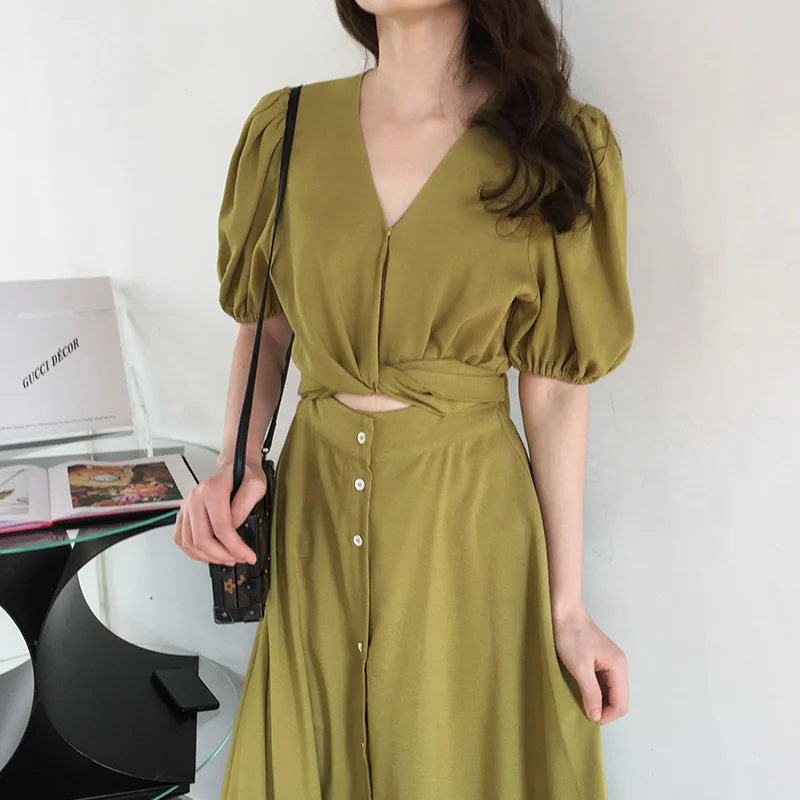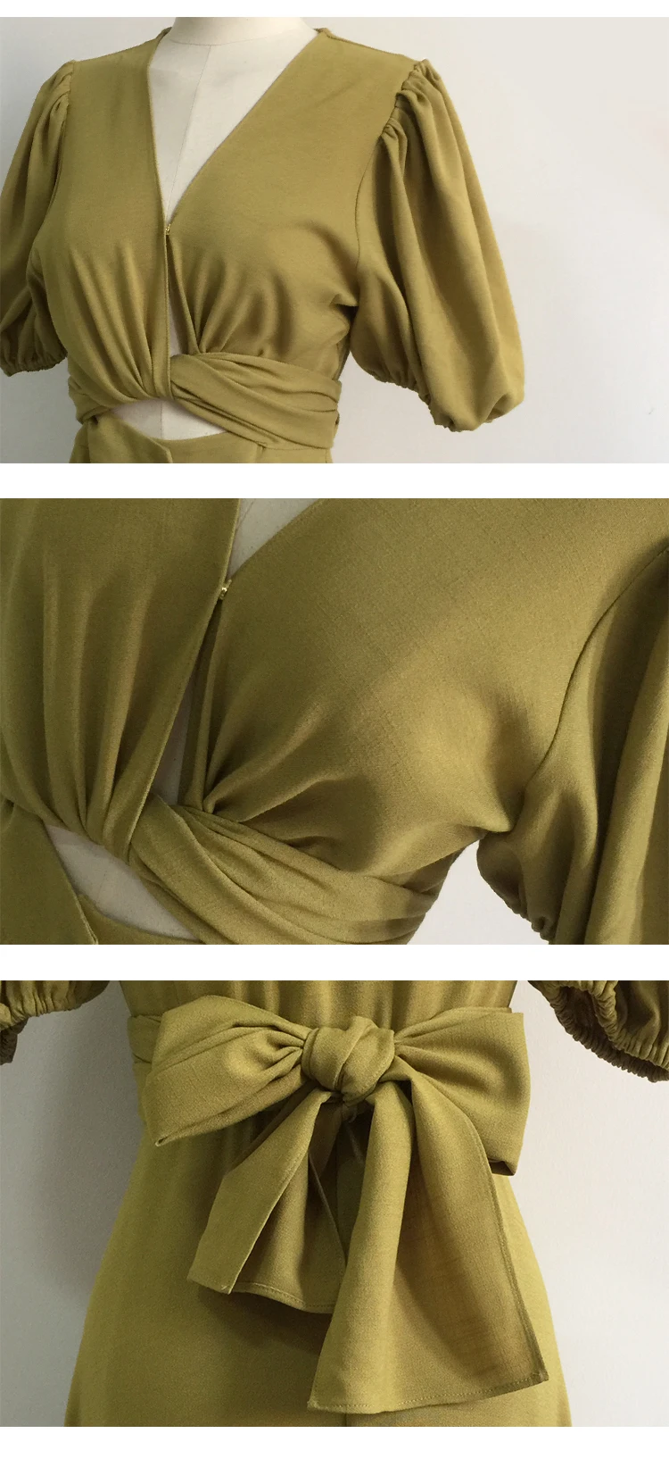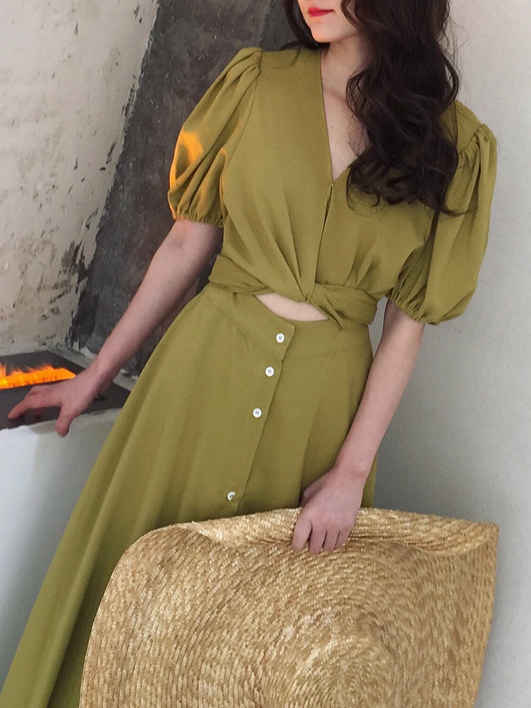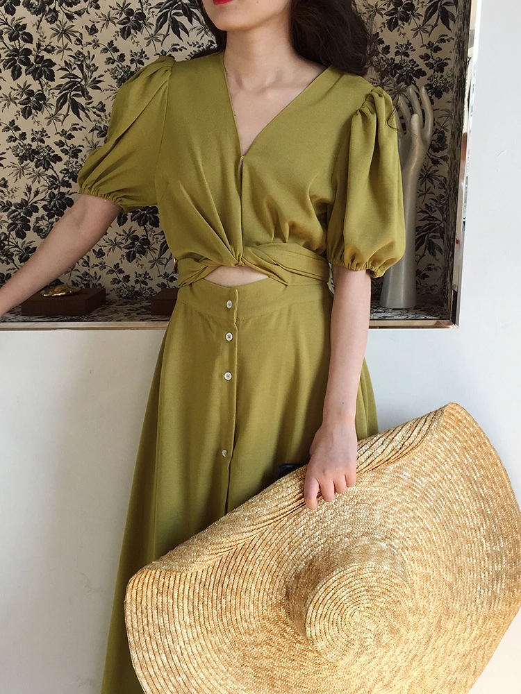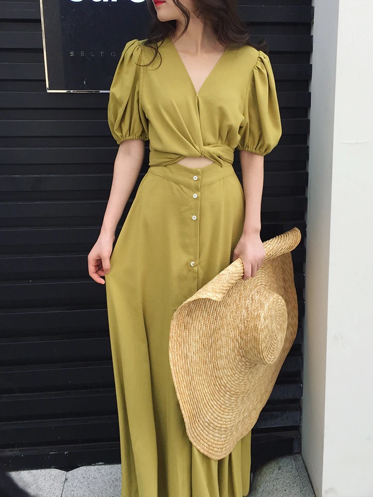 Women Beach Holiday Club Dresses French Style Twist Waist Hollow Out Solid Green V Neck Maxi Dress Summer 2020