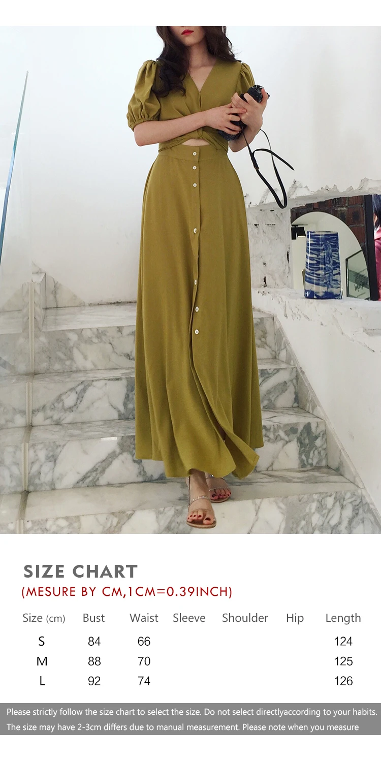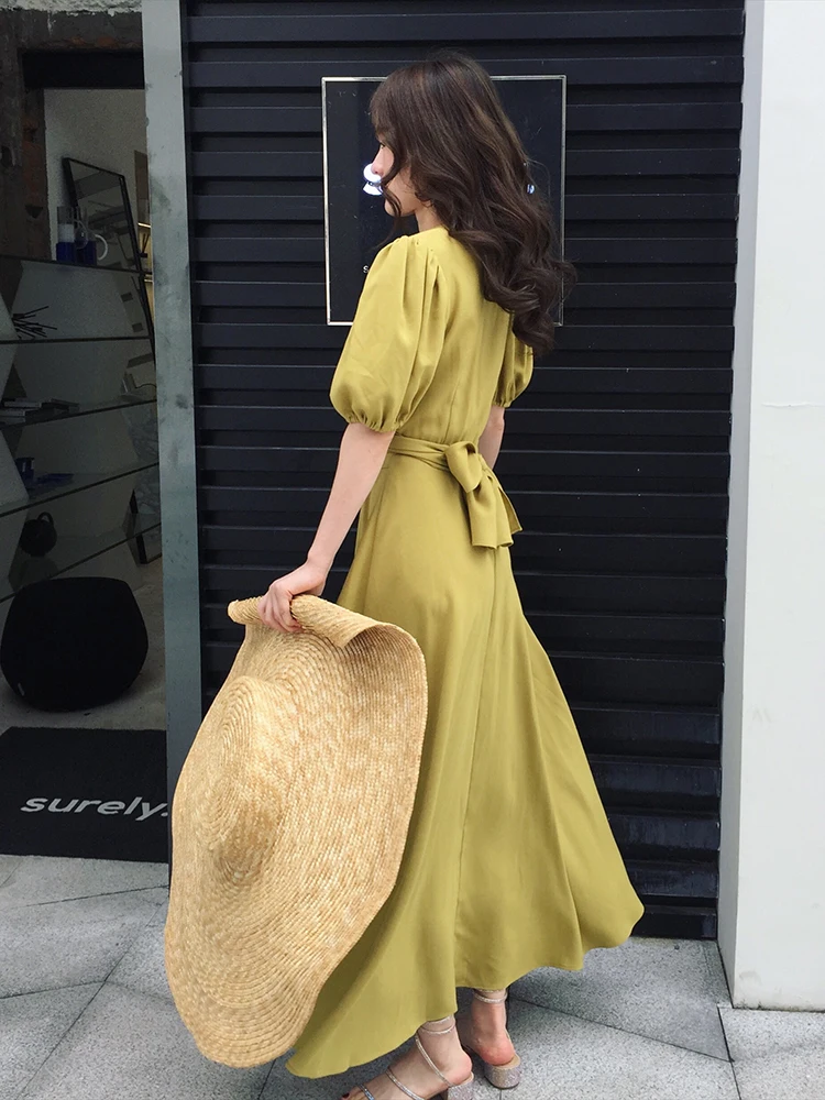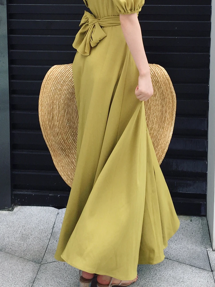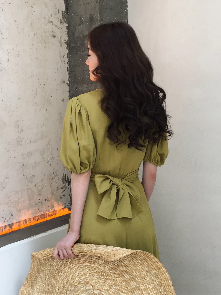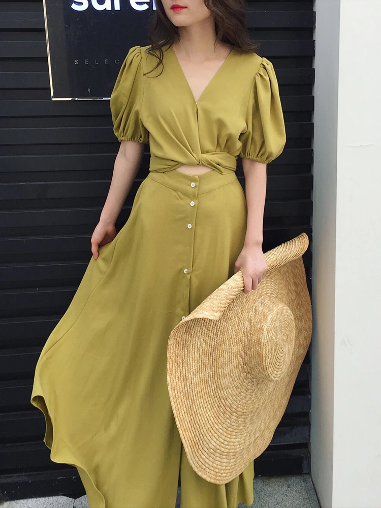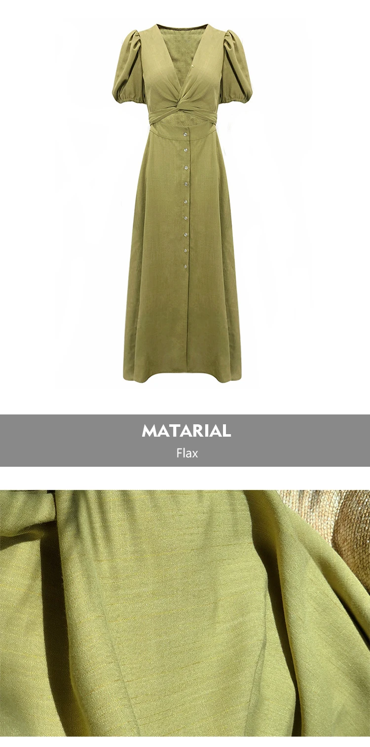 Women Beach Holiday Club Dresses French Style Twist Waist Hollow Out Solid Green V Neck Maxi Dress Summer 2020