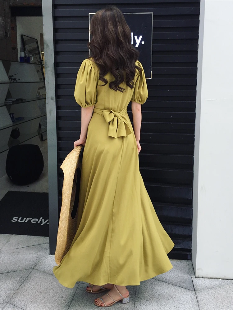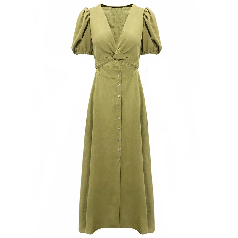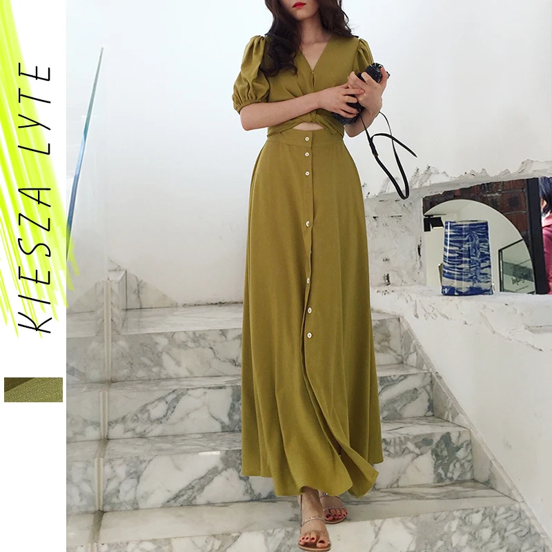 Women Beach Holiday Club Dresses French Style Twist Waist Hollow Out Solid Green V Neck Maxi Dress Summer 2020