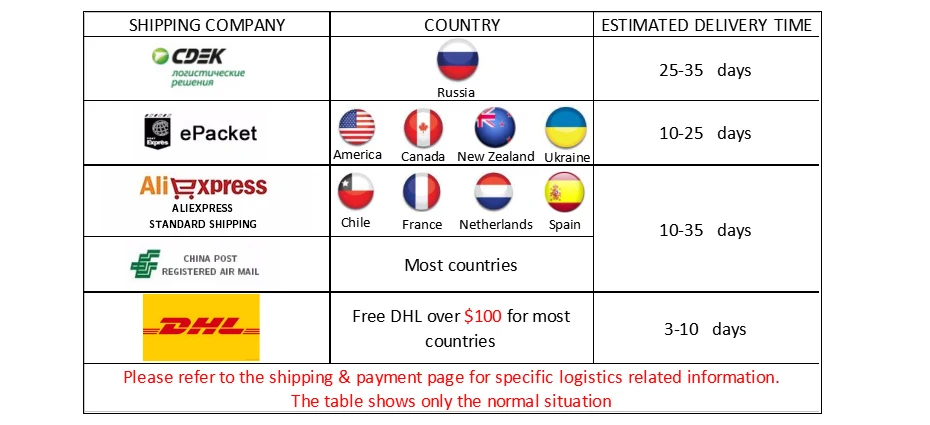 Packages from our warehouse in China will be shipped by ePacket or EMS depending on the weight and size of the product. Packages shipped from our US warehouse are shipped through USPS.