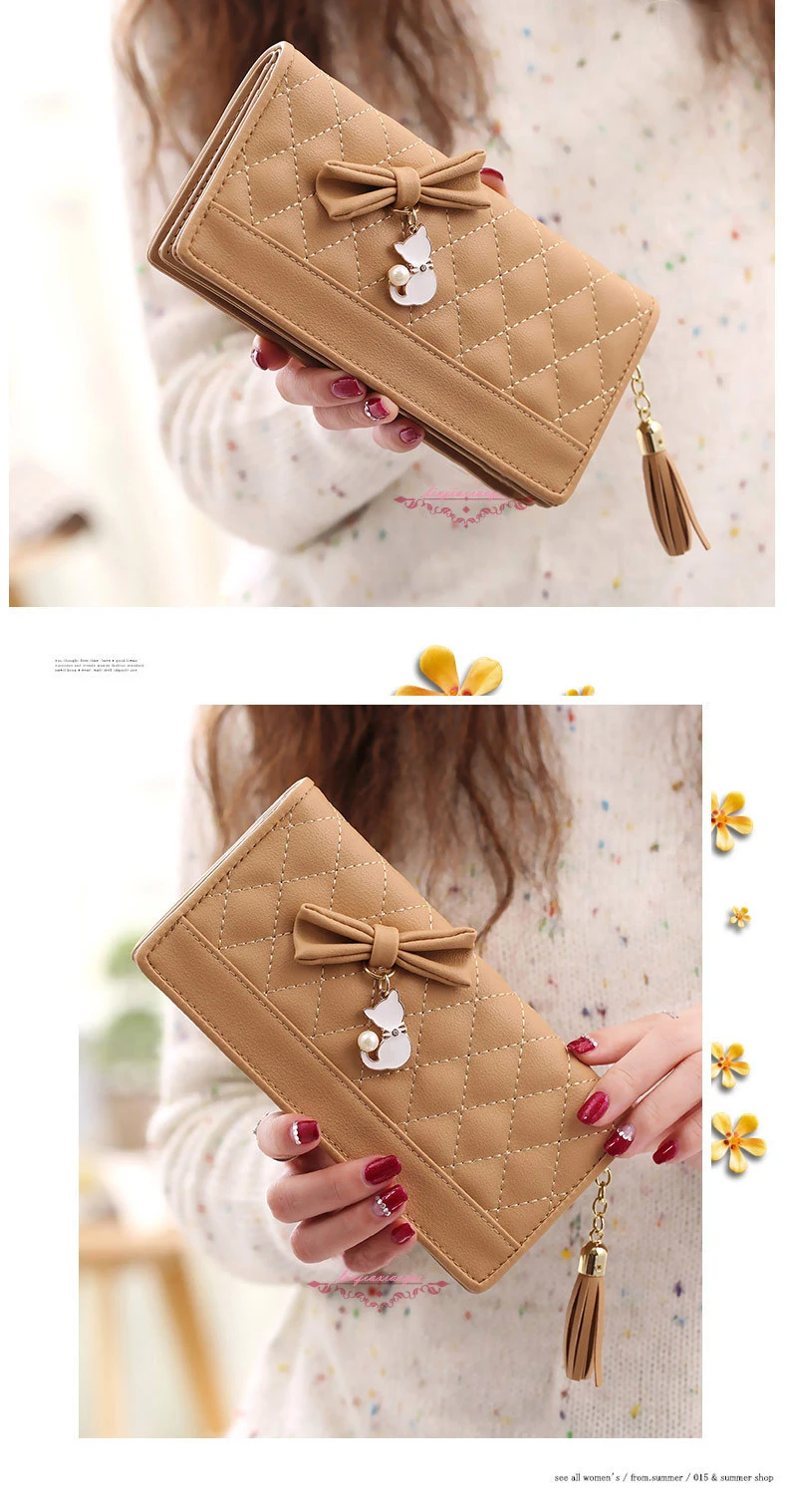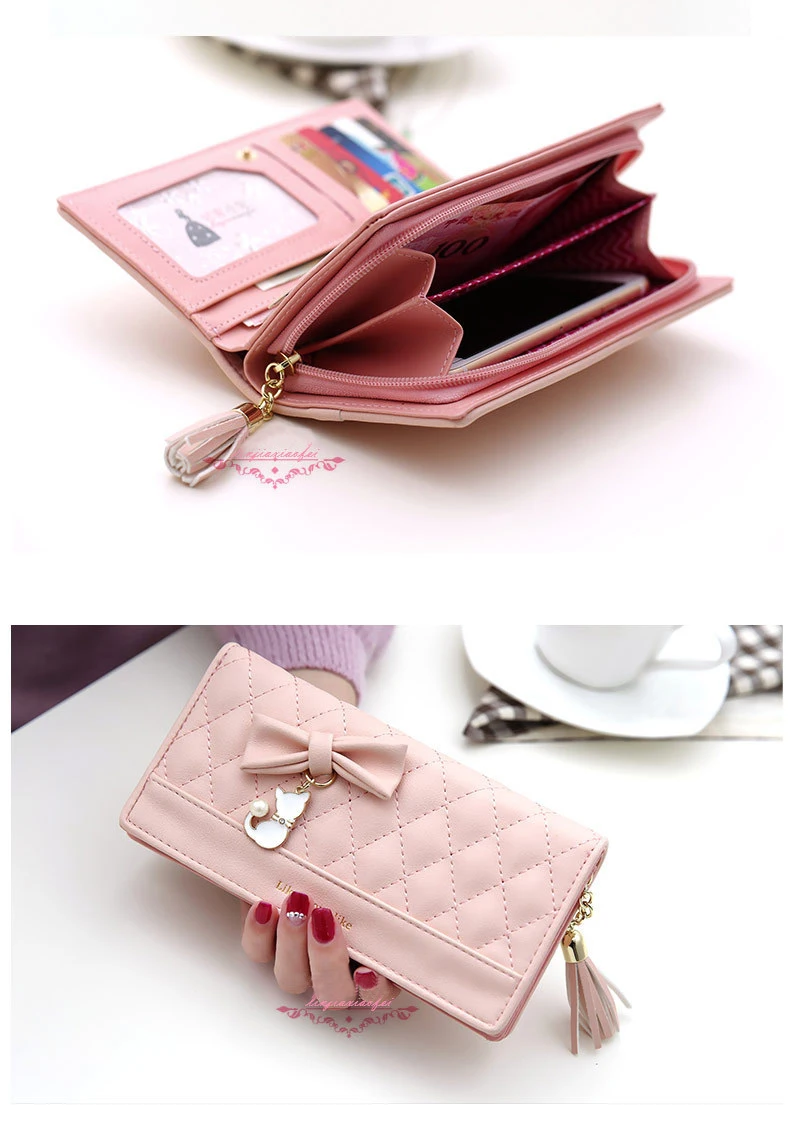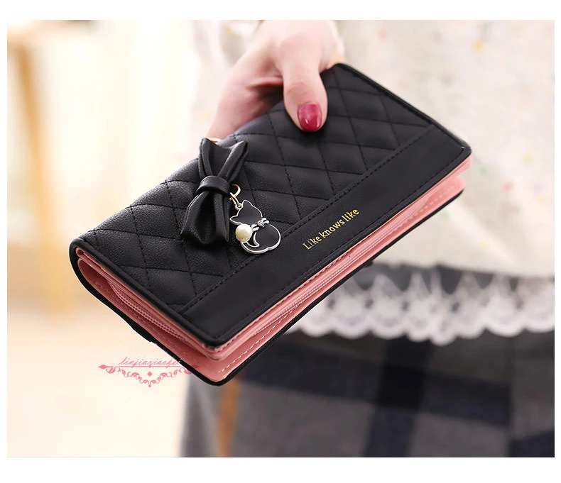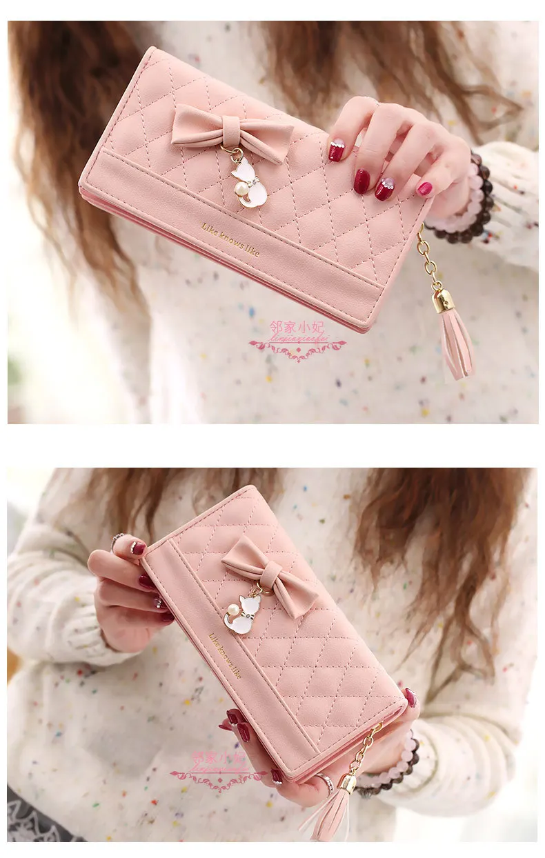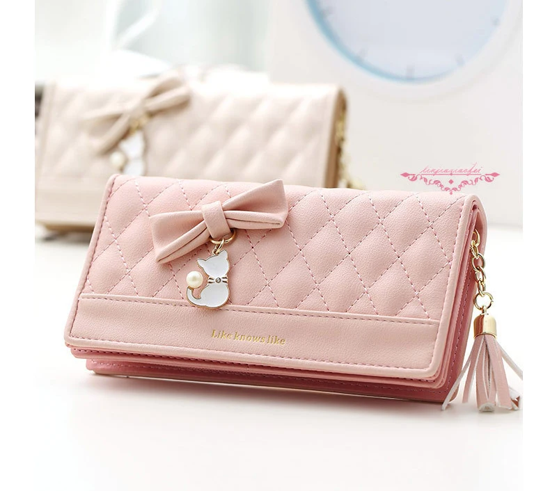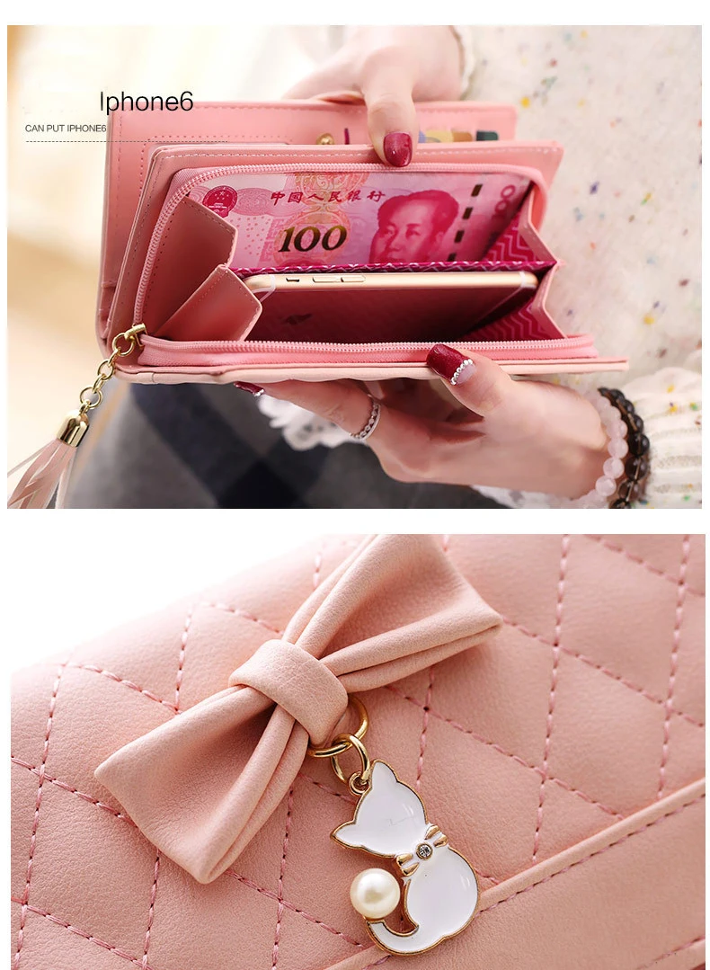 Design of the leather purse with bow and cat pendant,cute and beautiful.