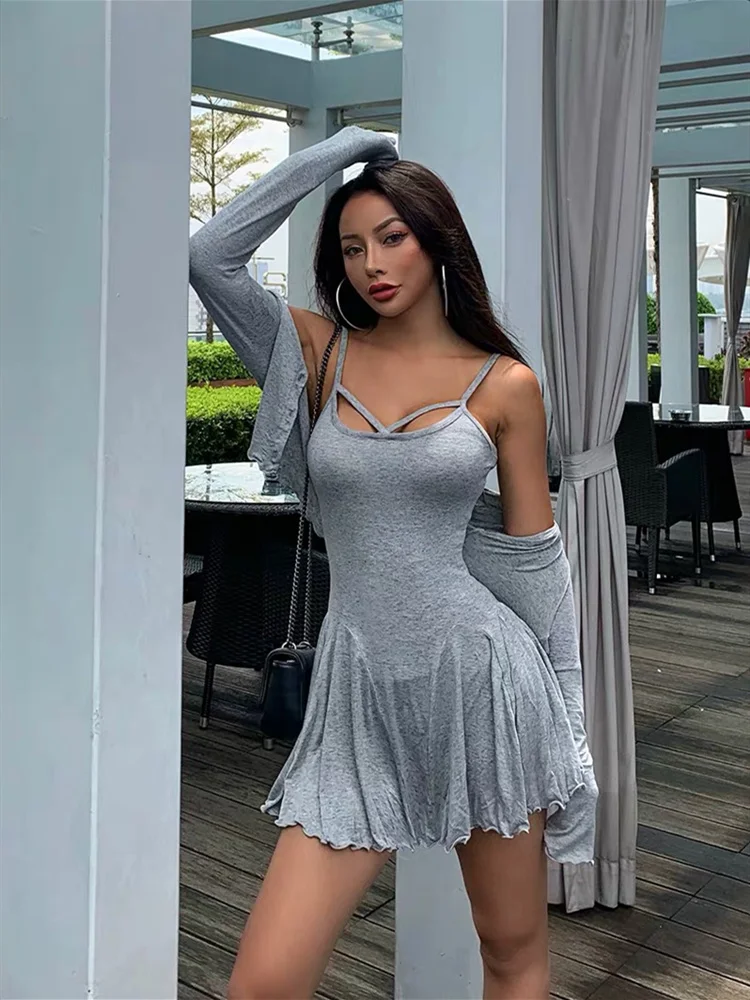 XIBANI Women two piece cotton suit skirt short cardigan long sleeve sexy low chest cross suspender pleated skirt slim nightclub
