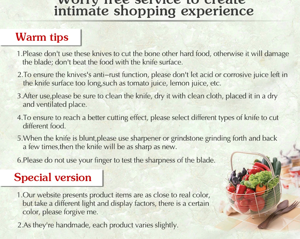 Handle : Excellent rosewood handle, surface polishing . Use for a long time not to distort, not faded, not shrinking, tasteless environmental protection.